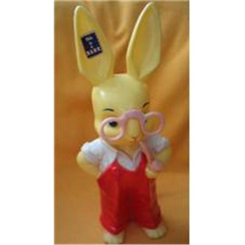 This adorable farmer bunny plastic bank was made by and marked: Knickerbocker Plastic Company/Glendale Calif./DES.PAT.170436. From the early 1950's he's dressed in his red overalls, smoking his pipe and wearing glasses this bunny still has the paper label attached to his ear and the original coin release disc on the bottom. In very good condition, he does have tape residue over his coin slot that I will leave to his new owner to clean, and he measures 11 1/2 inches tall, 4 3/4 inches wide and 3 1/2 inches deep. A wonderful addition to any rabbit, Knickerbocker Plastics or Bank Collection. <BR> SH & Ins. will be quoted after orders placed. If you have questions please contact me and thank you for looking.