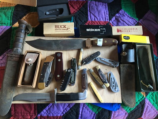 Knife collection includes many vintage pocket knives, buck knices, etc. This lot can be picked up in Woodbury CT for local buyers, or our shipper can pick up and ship to your location.
