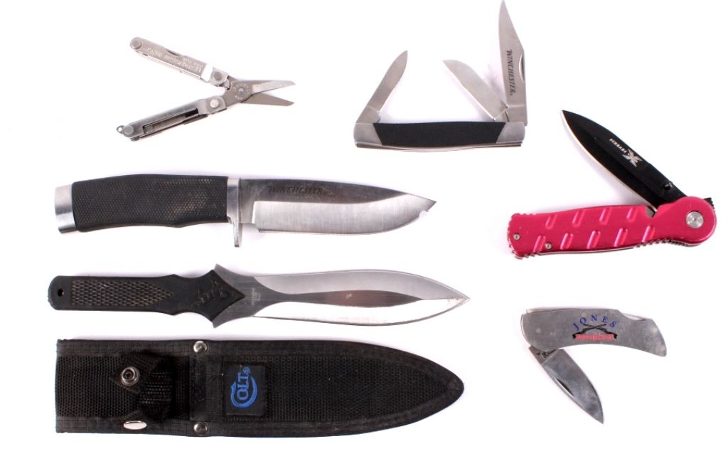 This lot features a collection of knives. They are made by Schrade, Winchester, Leatherman, and Colt. All the knives are in very good condition. They measure 2.75" to 7.5" in length.