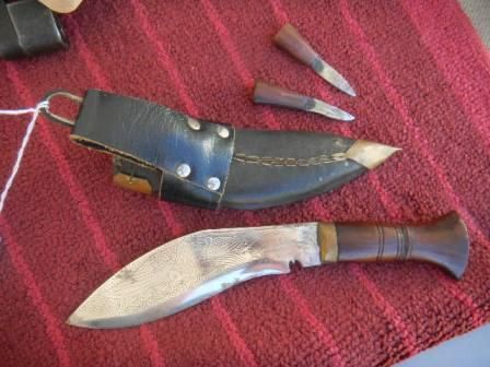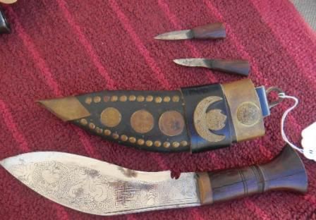 Probably India is Fighting Knife with scabbard. The Scabbard is leather and brass covered wood. The scabbard has three coins on the face and also holds two mini knives. The Blade is heavily engraved with bird motif on one side and fish motif on the other side. Total measurement is 11x2x2 inches Shipping $12.50