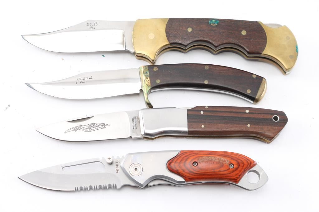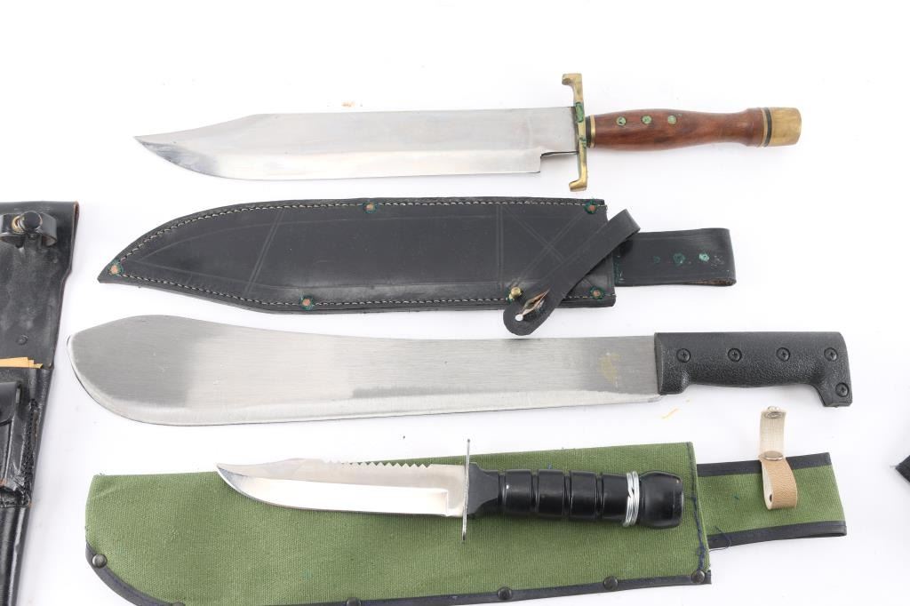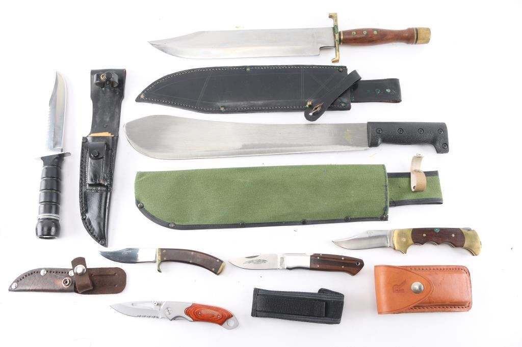 Seven total. Includes 1 - Siggma 3 1/2" fixed blade w/brown leather sheath; 1 - Eagle Brand Cutlery folder, 3" blade w/nylon sheath; 1 - Rigid folder, 3 1/2" blade w. tan leather sheath; 1 - Field and Stream folder, 3" blade half serrated; 1 - after market survival knife w/6" partially sharpened clip point/ top serrated blade w/ compass in pommel, matches, finishing line & hook, saw wire and rings in handle & black leather sheath/sharpening stone; 1 - unmarked Bowie knife, possible Pakistan/India make w/12" partially sharpened blade, brass guard, pommel and black leather sheath and 1 - Machete made in Taiwan w/15" blade and green nylon sheath. All in good condition or better.