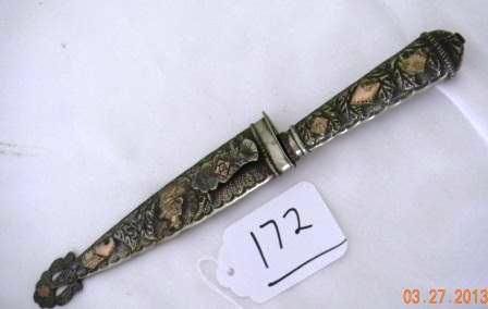 Knife and Sheath. silver on handle and sheath Circa 1940. Item has gold overlay on sheath and handle. Item 172 has dancing couple. Measures 11 by 1 1/2 inches. Good Condition. Shipping $20.00