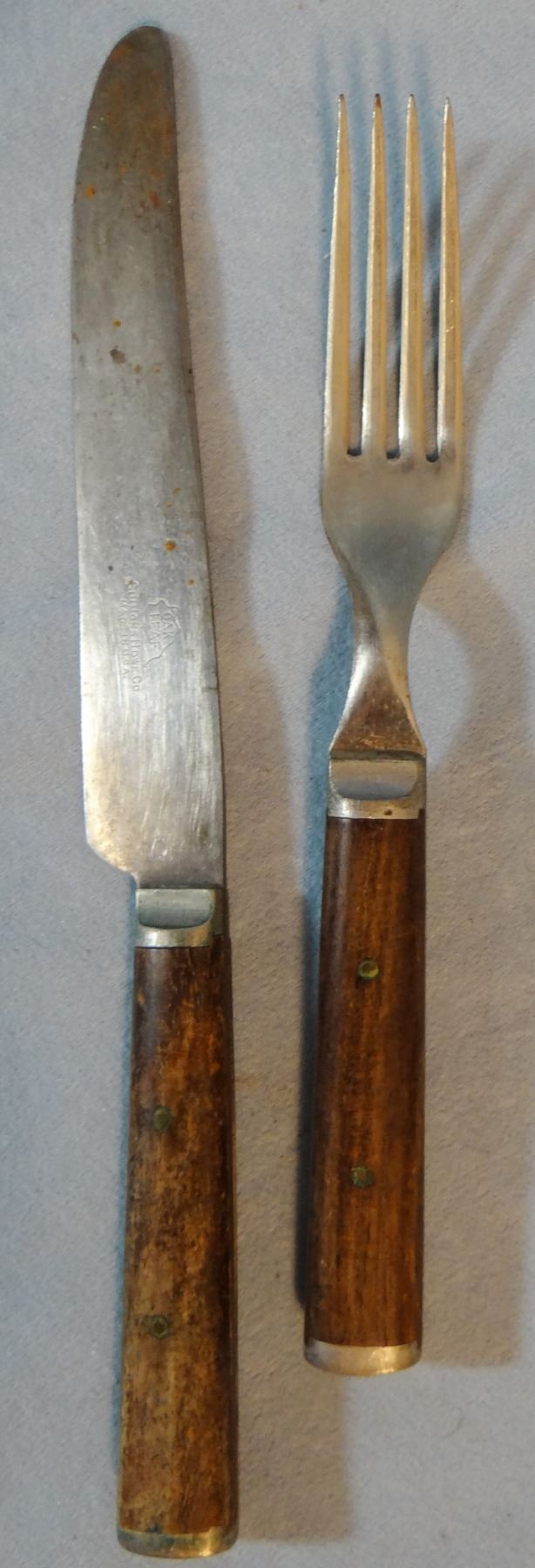 Knife and fork and graniteware U. S. cup, bottom marked