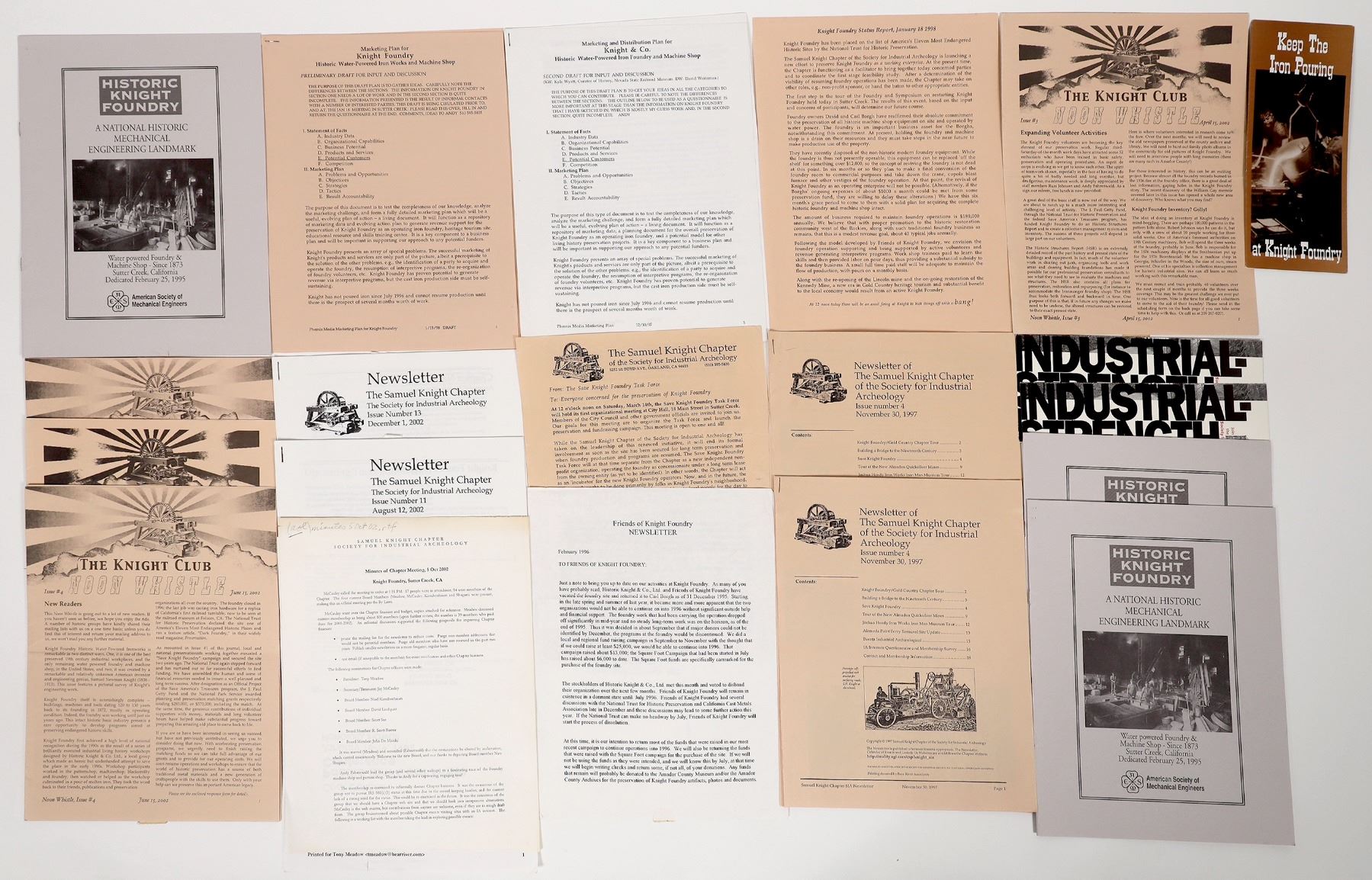 File from Knight Foundry in Sutter Creek. Brochures, The Knight Club 2002 Noon Whistle with dupes, News letters, historical pamphlet etc. See photo.