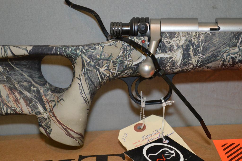 Knight Model Disc Extreme .50 Perc cal Bolt Action Inline Black Powder Rifle w/ 26" bbl [ N.I.Box w/booklet, stainless finish with blued sights, camo finished Right Hand thumb hole pistol grip stock, w/recoil pad, brass tipped ramrod ] Ser # 5000672