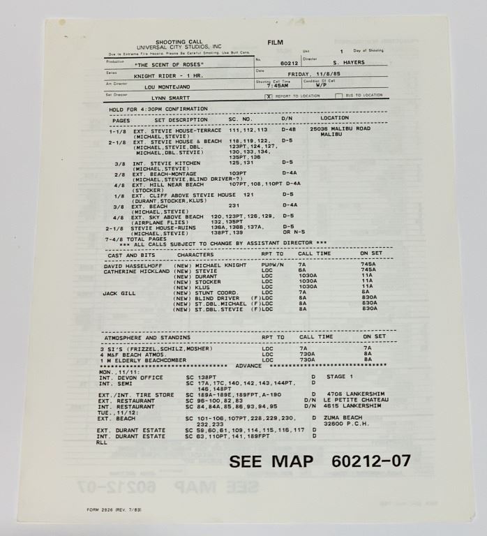 Original production used call-sheet from the action crime television series 'Knight Rider' (1982 1986), created and produced by Glen A. Larson.