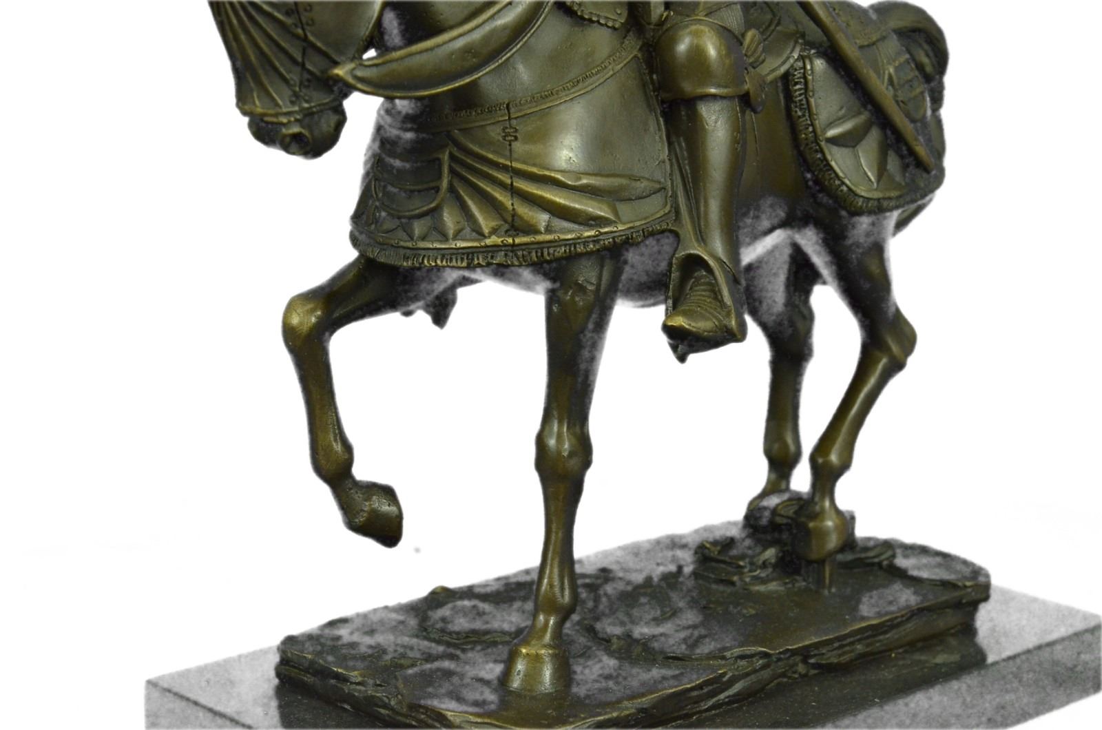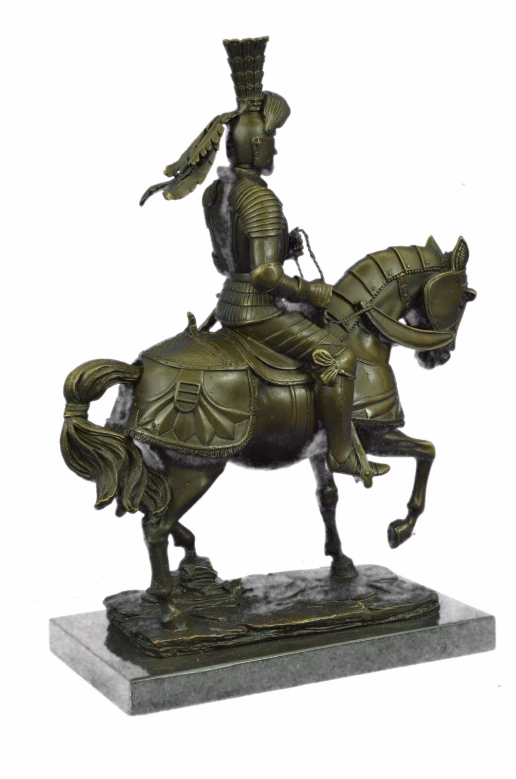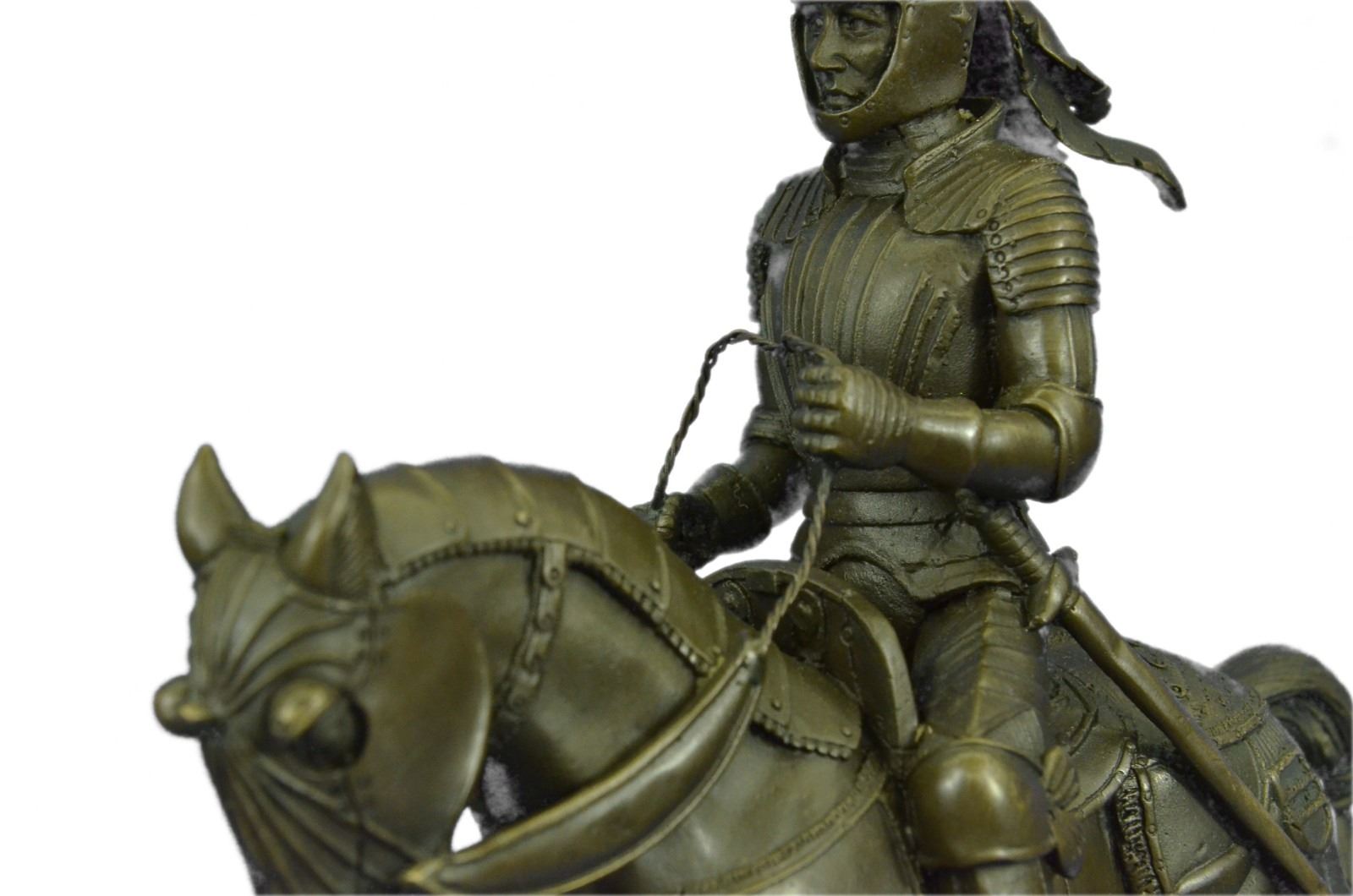 Ladies, have you always dreamed of having a Knight in Shining Armor sweep you off of your feet? Gentlemen, do you long for adventure and wish that you were battling fire breathing dragons rather than the rats in today's race? This impressive Knight Bronze sculpture may not transport you into another time and place, but it is a beautiful reminder of just such dreams. Bronze Dimensions with Marble Base: Height 13 X Width 10 inches. Weight: 12 LBS. Inventory : 6965B33196