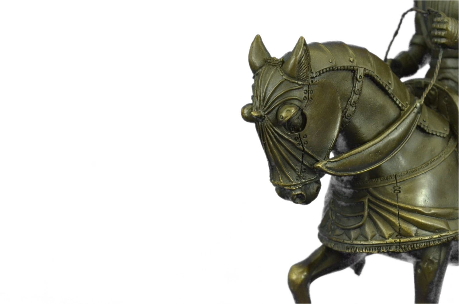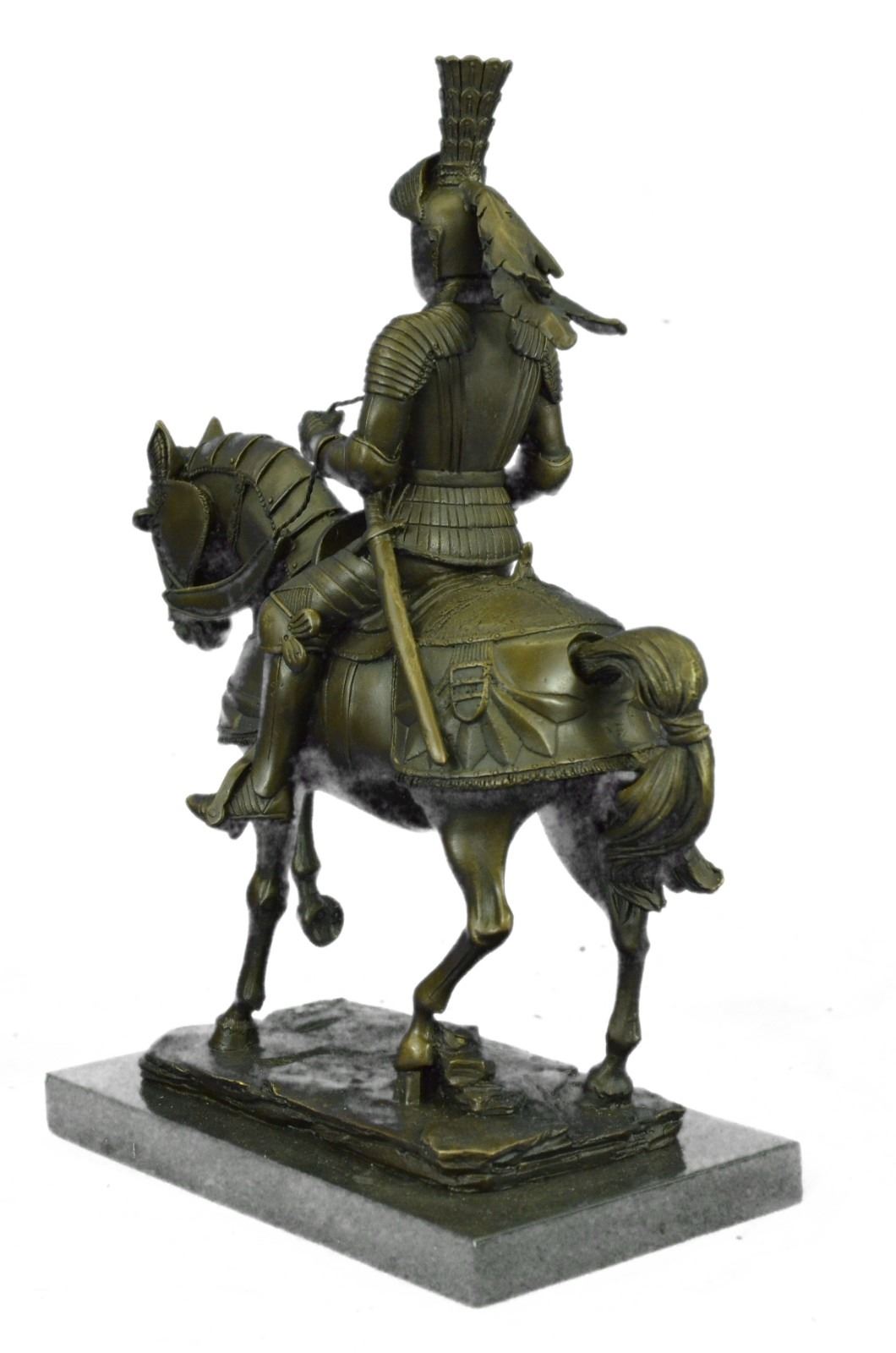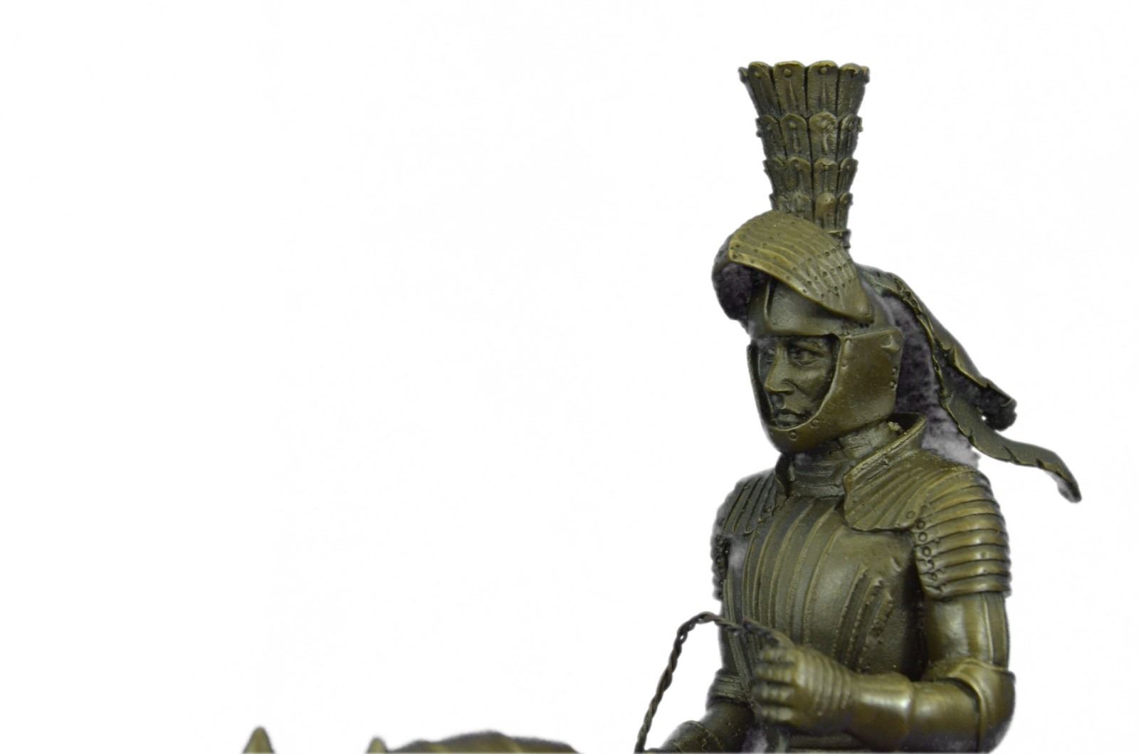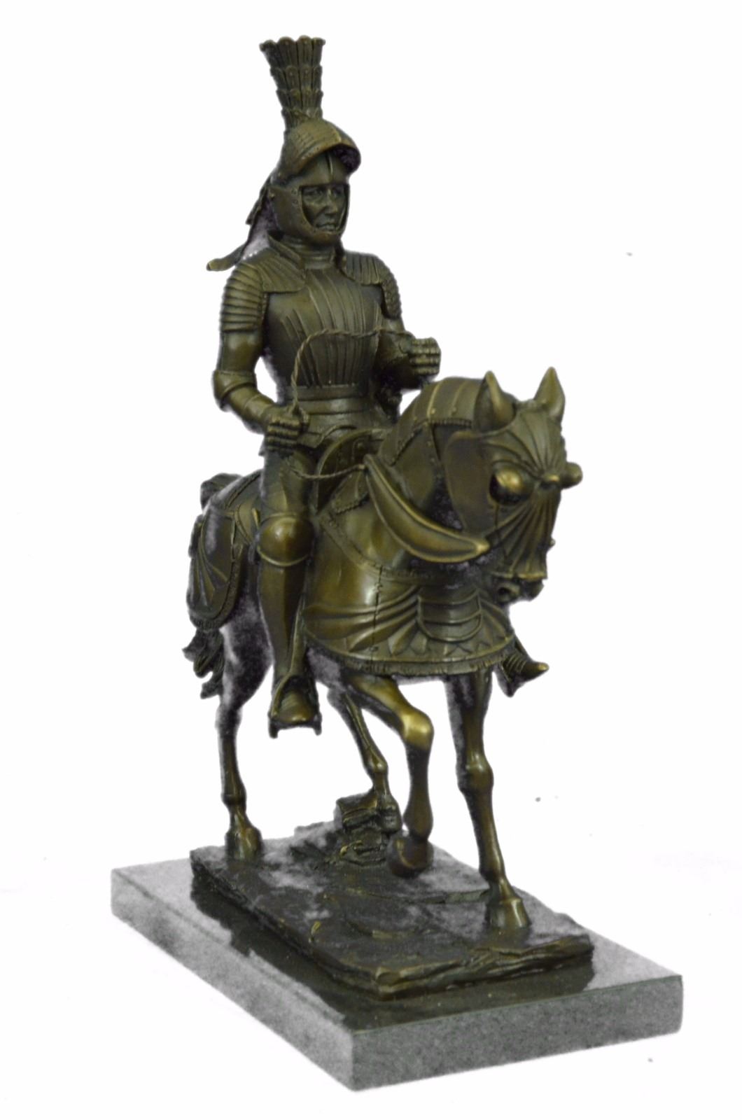 Ladies, have you always dreamed of having a Knight in Shining Armor sweep you off of your feet? Gentlemen, do you long for adventure and wish that you were battling fire breathing dragons rather than the rats in today's race? This impressive Knight Bronze sculpture may not transport you into another time and place, but it is a beautiful reminder of just such dreams. Bronze Dimensions with Marble Base: Height 13 X Width 10 inches. Weight: 12 LBS. Inventory : 6965B33196