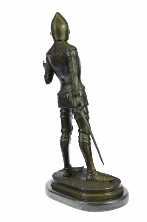This impressive Knight Bronze sculpture may not transport you into another time and place, but it is a beautiful reminder of just such dreams. This Magnificent Knight stand 15 inches High and 8 inches long. Every detail, from the intricate armor to the braided mane of this mighty steed, will leave little doubt that our amazing warrior is a highly collectible work of art. From the romantic era of chivalrous knights, this museum replica is cast in quality solid bronze and finished in dark patina. Bronze Dimensions with Marble Base: Height 15 X Width 8 inches. Weight: 12 LBS.