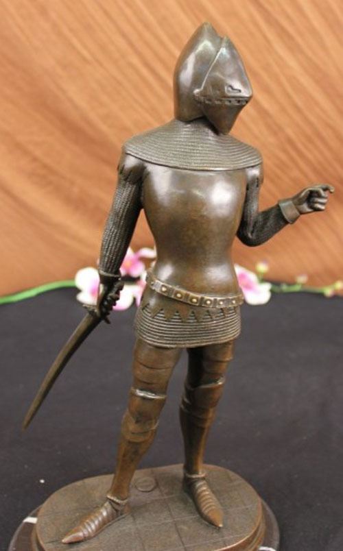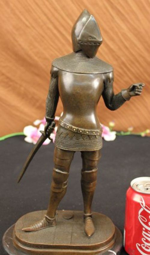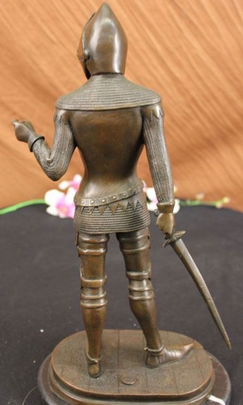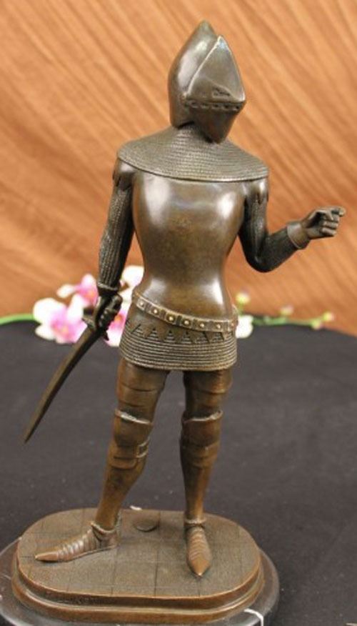 This Impressive Knight Bronze Sculpture May Not Transport You Into Another Time And Place, But It Is A Beautiful Reminder Of Just Such Dreams. Every Detail, From The Intricate Armor To The Braided Mane Of This Mighty Steed, Will Leave Little Doubt That Our Amazing Warrior Is A Highly Collectible Work Of Art. From The Romantic Era Of Chivalrous Knights, This Museum Replica Is Cast In Quality Solid Bronze And Finished In Dark Patina. This Magnificent Knight Stand 15 High And 8 inches Long. Weight: 12LBS.Please Note: This is a reproduction bronze sculpture from the original molded and signed. This featured bronze sculpture is a recast after the original, and has been done recently. This 100% bronze sculpture is an abstract piece certain to be a conversation piece.Please Note: This is a reproduction bronze sculpture from the original molded and signed. This featured bronze sculpture is a recast after the original, and has been done recently. This 100% bronze sculpture is an abstract piece certain to be a conversation piece.