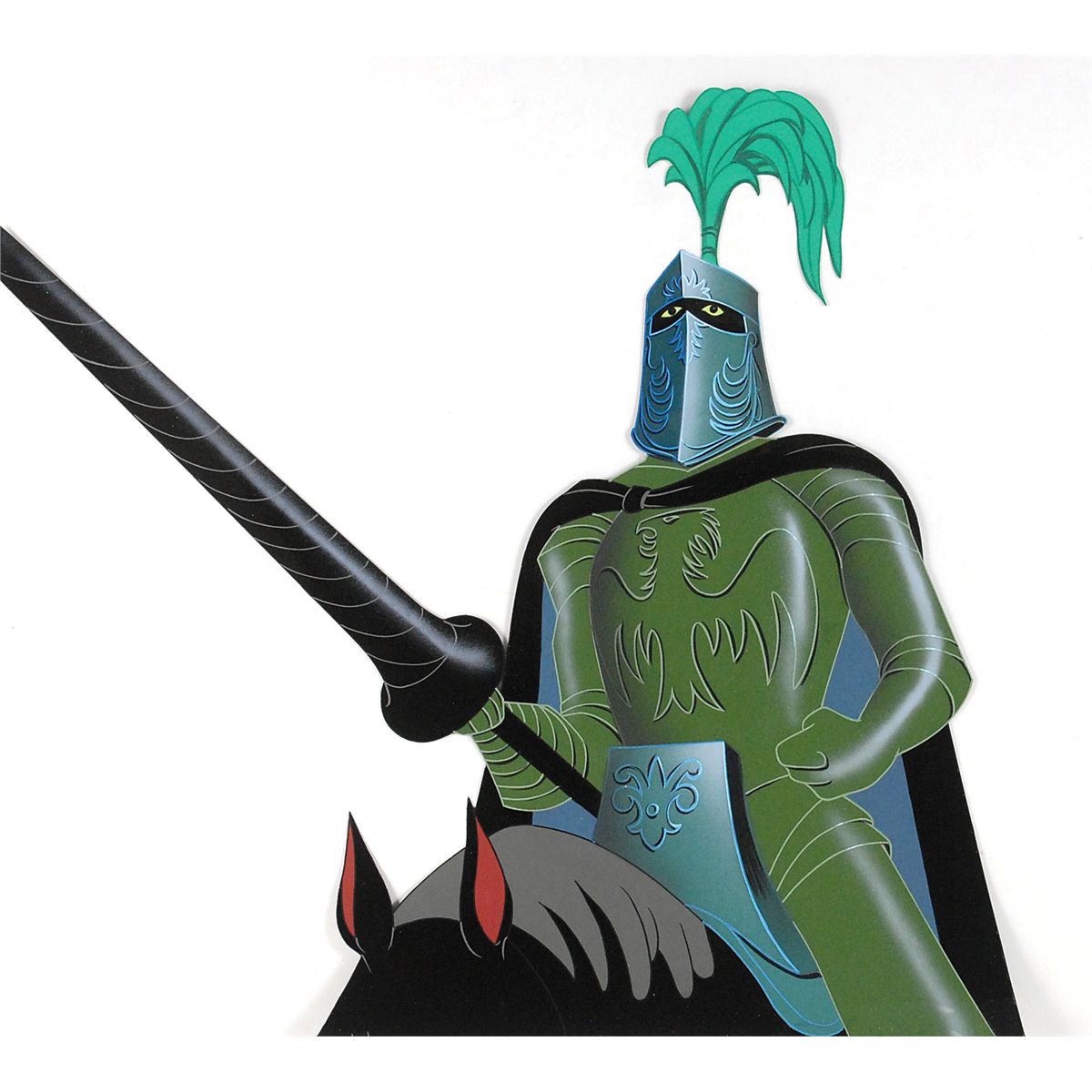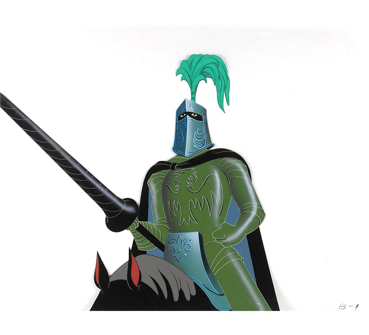 (Walt Disney Studios, 1957) Original production cel featuring “Knight on Horse” from The Truth About Mother Goose. The incredibly detailed image of the knight on his horse measures 12 x 11, with impressive additional hand-inking and paint applied to the front of the image, resulting in a remarkable image. The overall dimensions are 16 x 12.5. In fine condition.