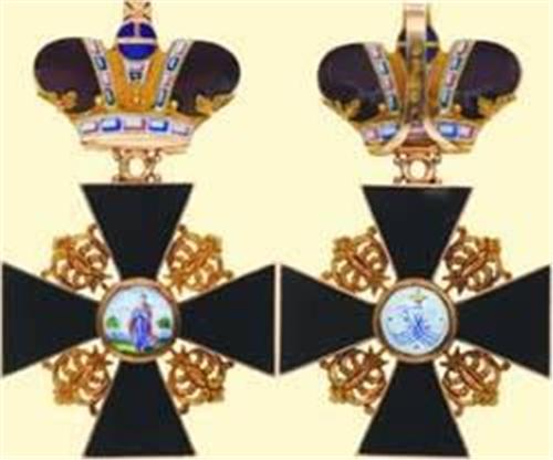 Knight's Cross 1st (or 2nd) class with Crown; sash or neck badge, gold with "black" enamel, painted medallions, Old Russian hallmarks (56), maker's mark "R.Sch" (?/in cyrillic letters), with garlands in the angles, movable enamelled crown, with ribbon loop on reverse (hallmarked); size 43,6 x 73,1 mm, weight ca. 24 gramme. Excellent old Russian quality in excellent condition and very rare! (see Durow, The Orders of Russia, p.114!)