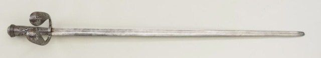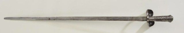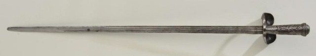 Knightly Sword with cast iron grip and guard early Broadsword blade assembled in Victorian era as decoration for castle or manor. The sword is 42-1/2” overall with 36” blade. The blade has been reduced and tapered. Thehilt shows figures of knights and scroll work. The blade is tempered and would date to the 17th century or earlier. Est.;$600-$1,200.