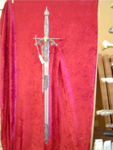 Pewter Finish 36" Sword, Decorative Metal Handle with spring-lock Decorative Metal Scabbord, 26" 440 Stainless Blade, Ground edge, For Display Only