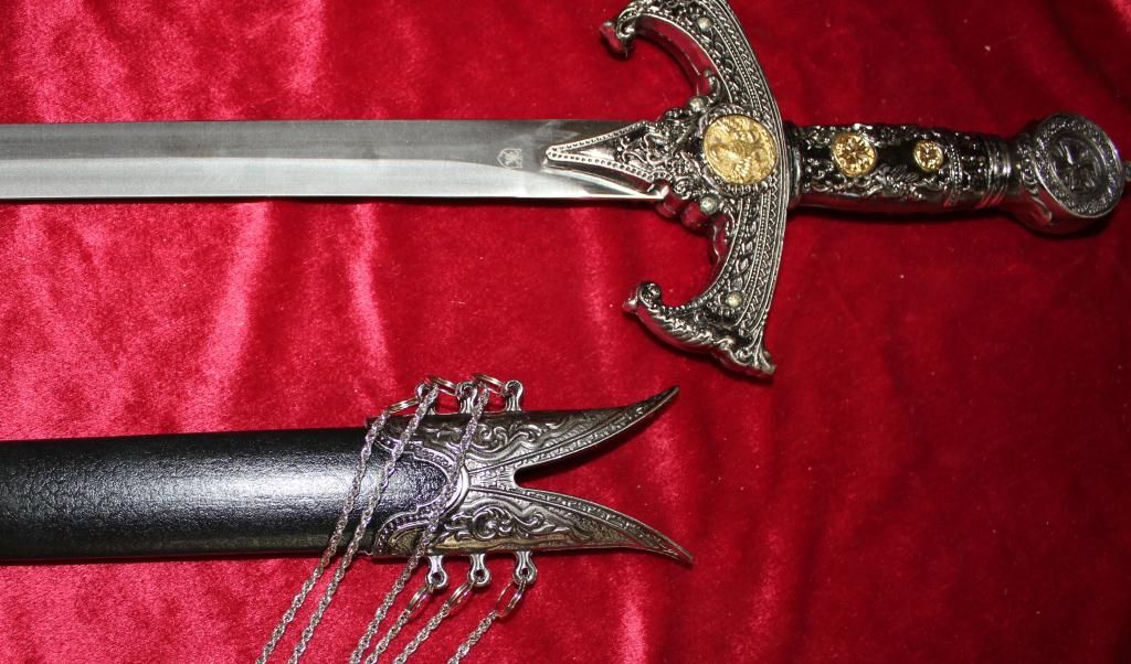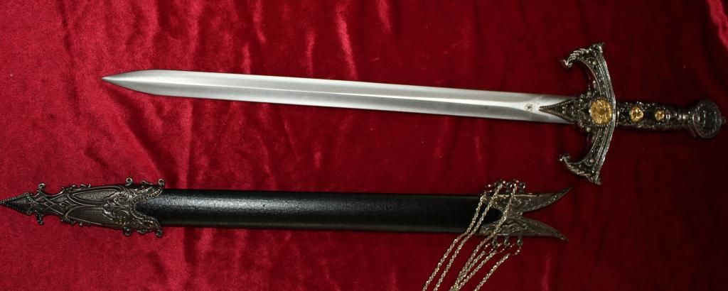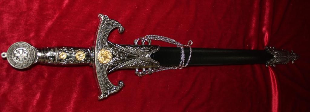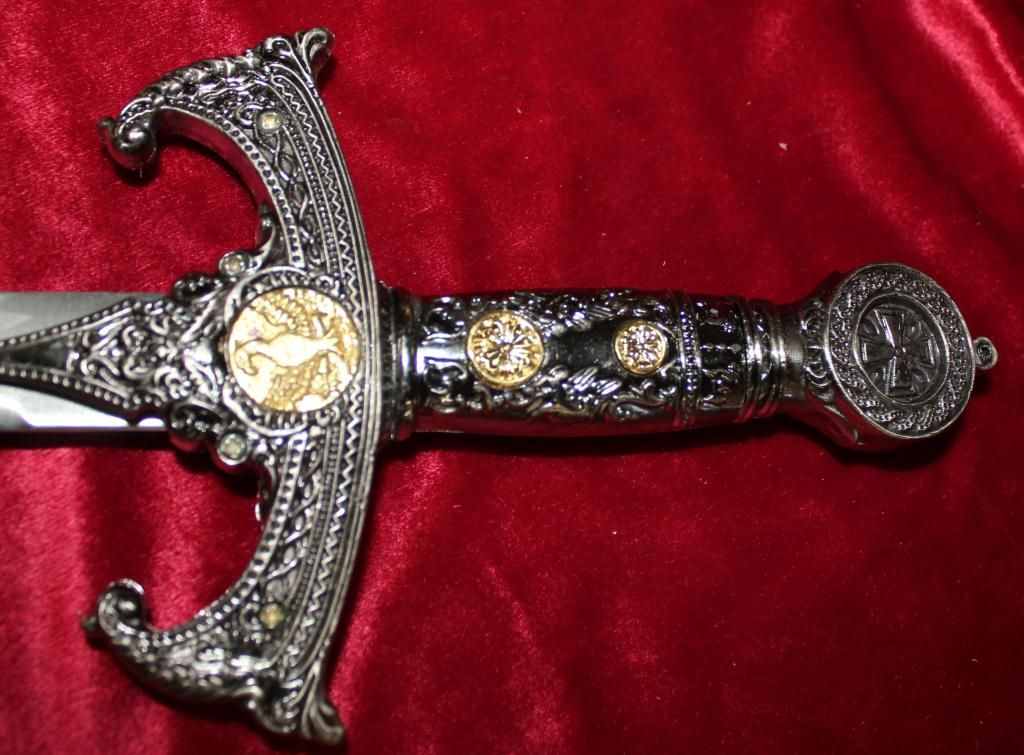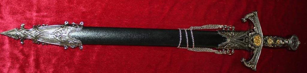 22" Overall Length, 14.5" Stainless Steel Blade With Mirror Finish. Cast Metal Handle Guard & Pommel Covered With Ornate Symbols & Engraving. Cast Metal Sheath