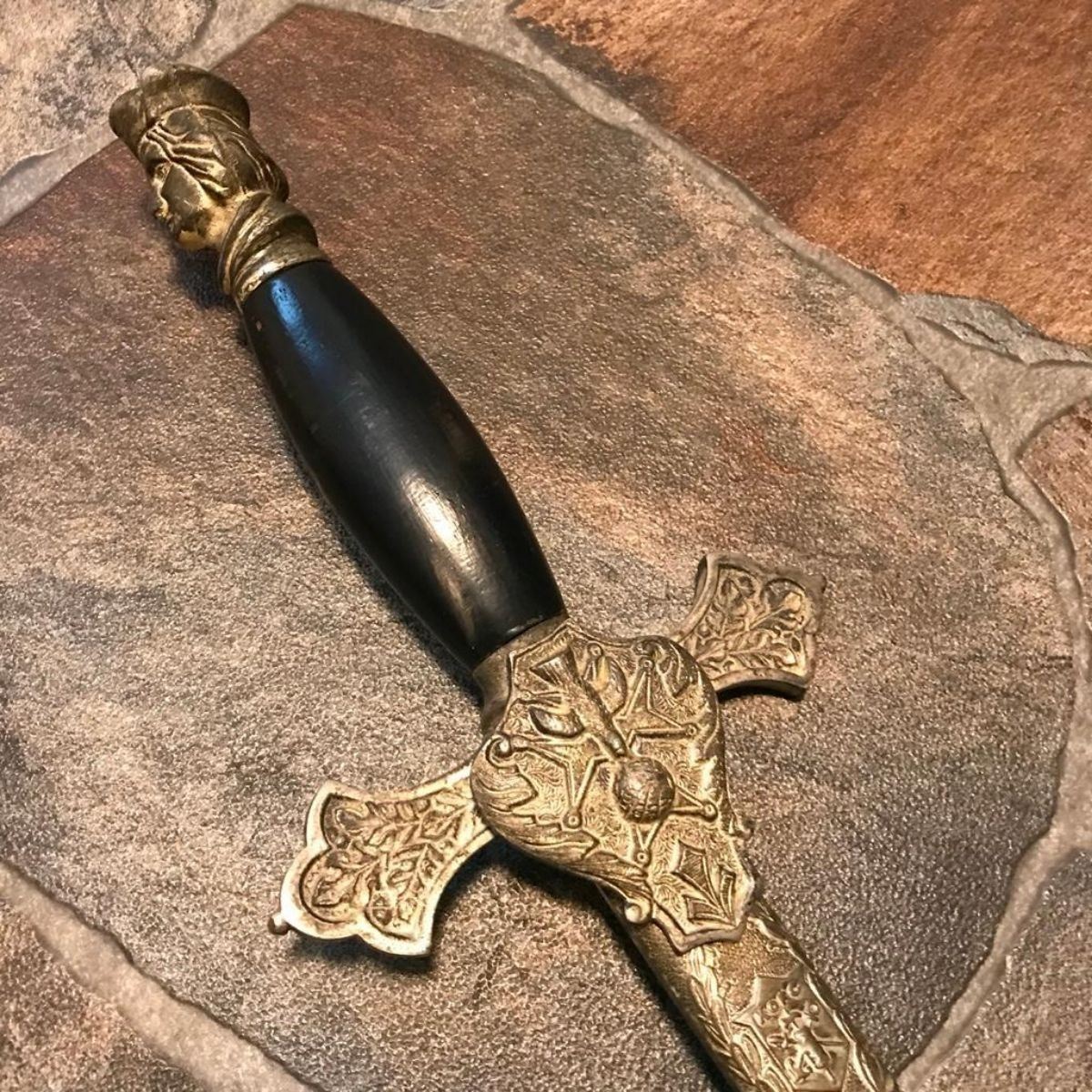 Knights of Columbus fraternal ceremonial sword with 28" etched blade & scabbard. 36 1/2" overall length.