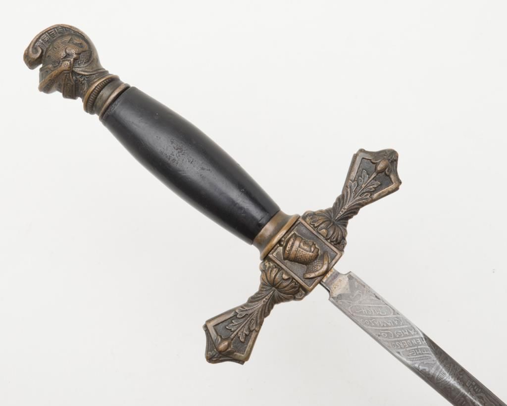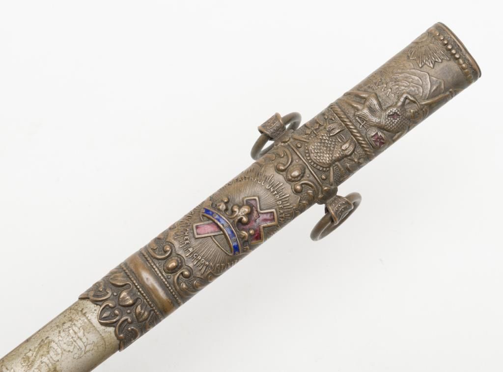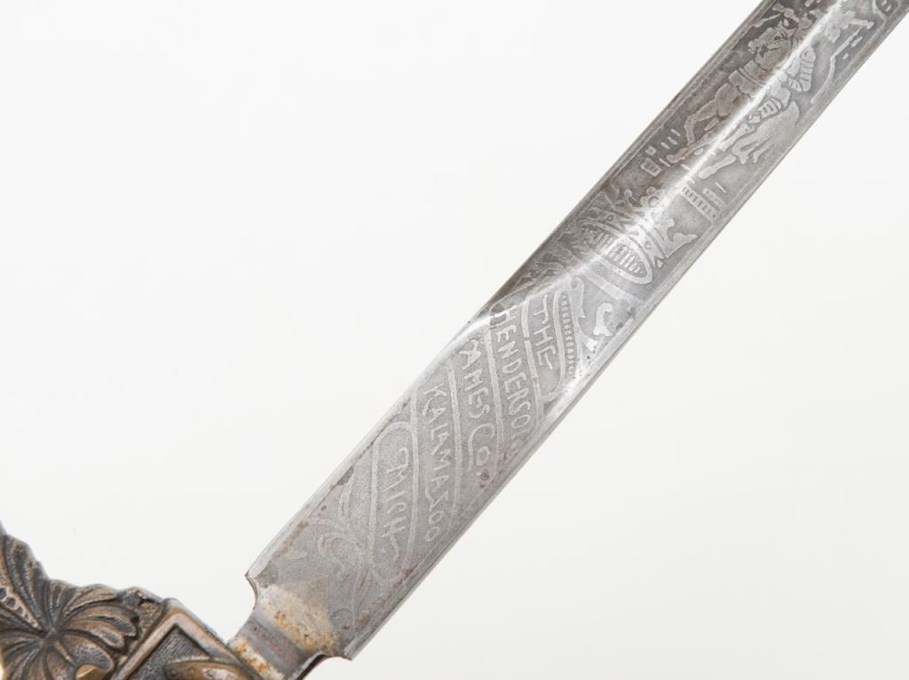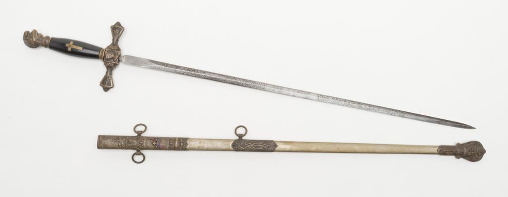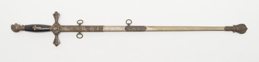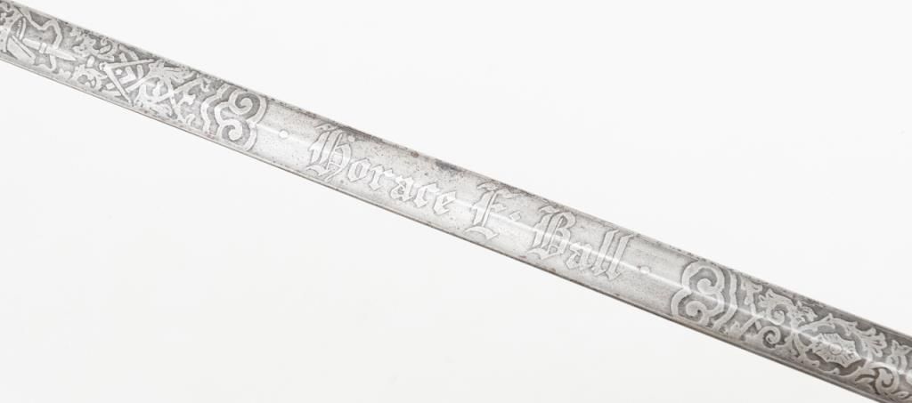 Knights of Columbus Fraternal sword with metal scabbard inscribed to Horace E. Ball; etched blade; sword by The Henderson Ames Co. Est.: $100-$200.