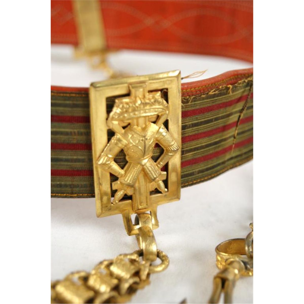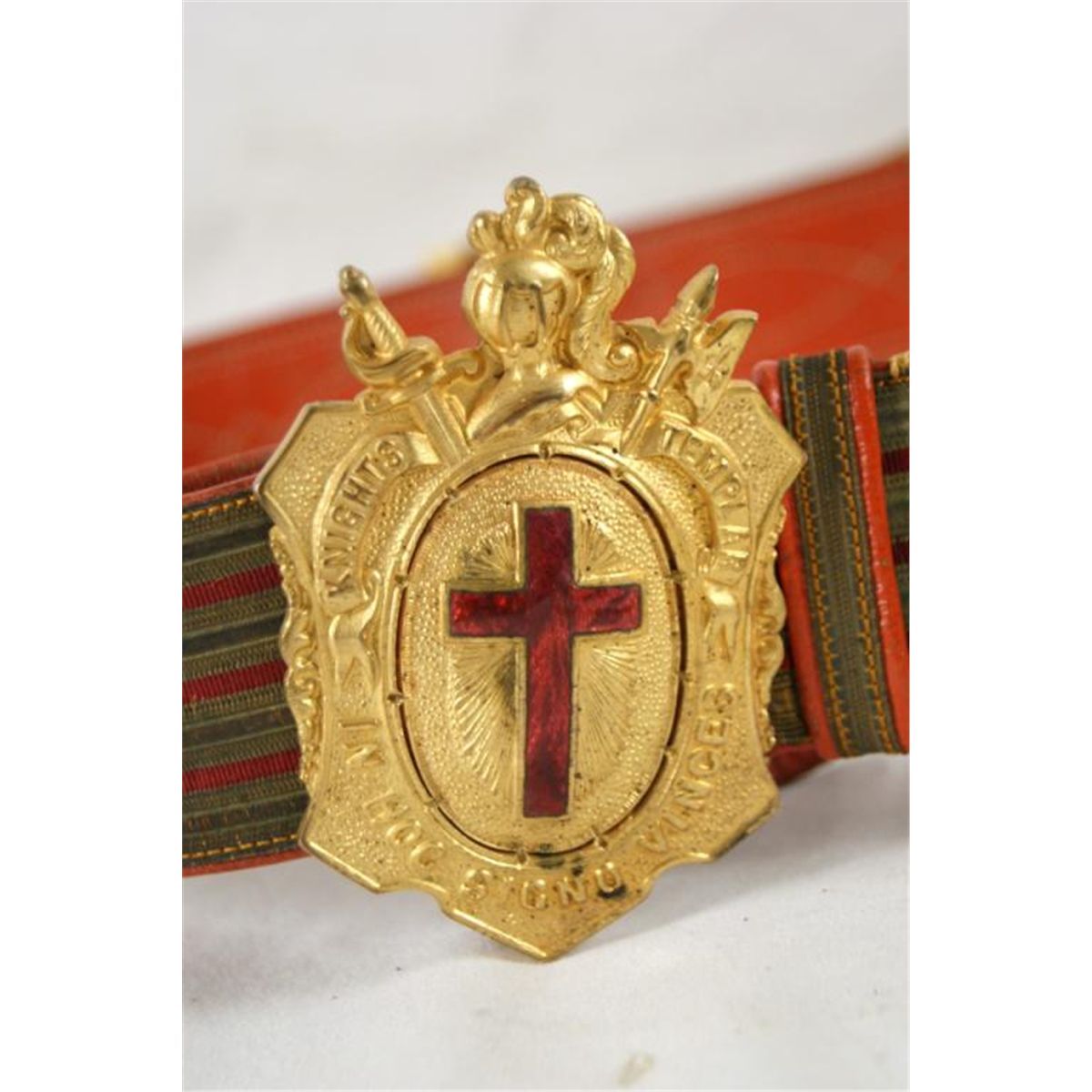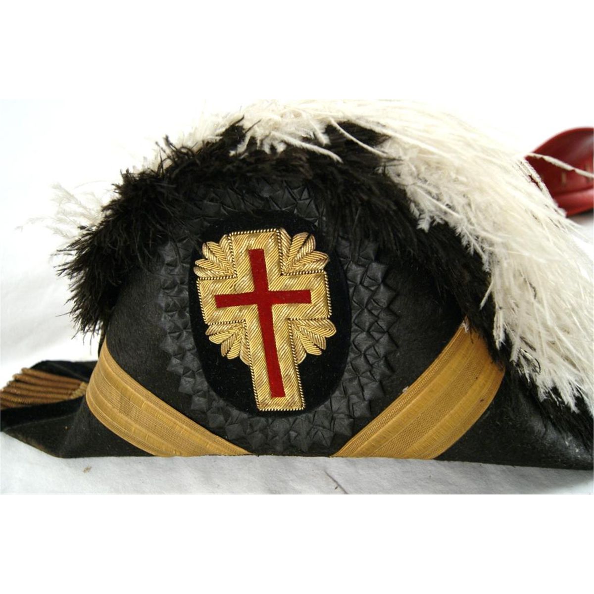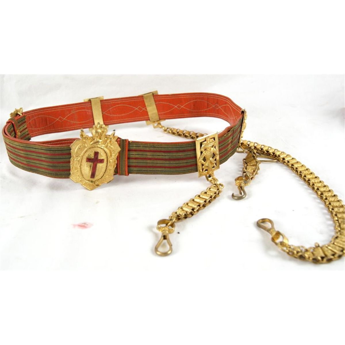 1 hat, 1 wide 'Cocked' hat, dress belt with gold chatelaine's, sash with Knights Templar insignia, matching arm cuffs circa 1900.