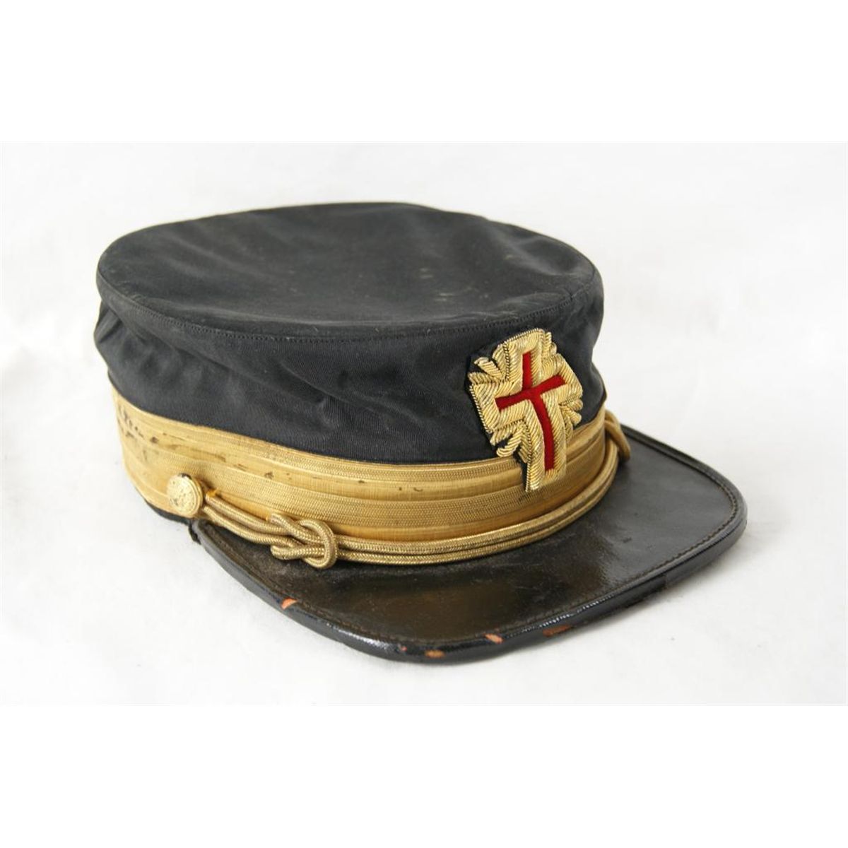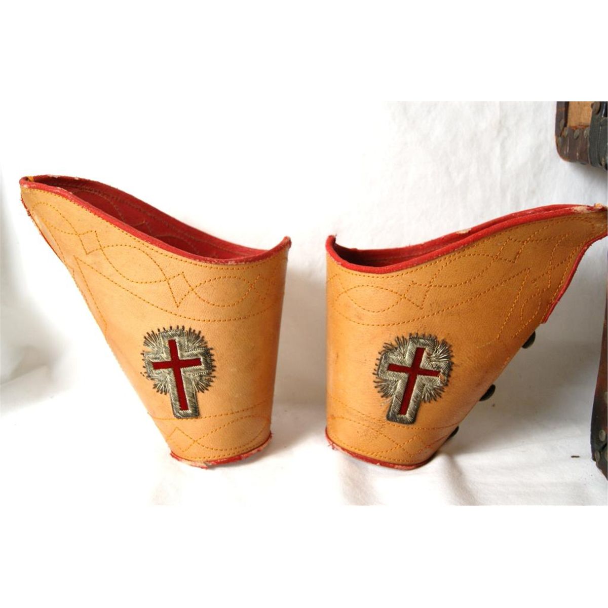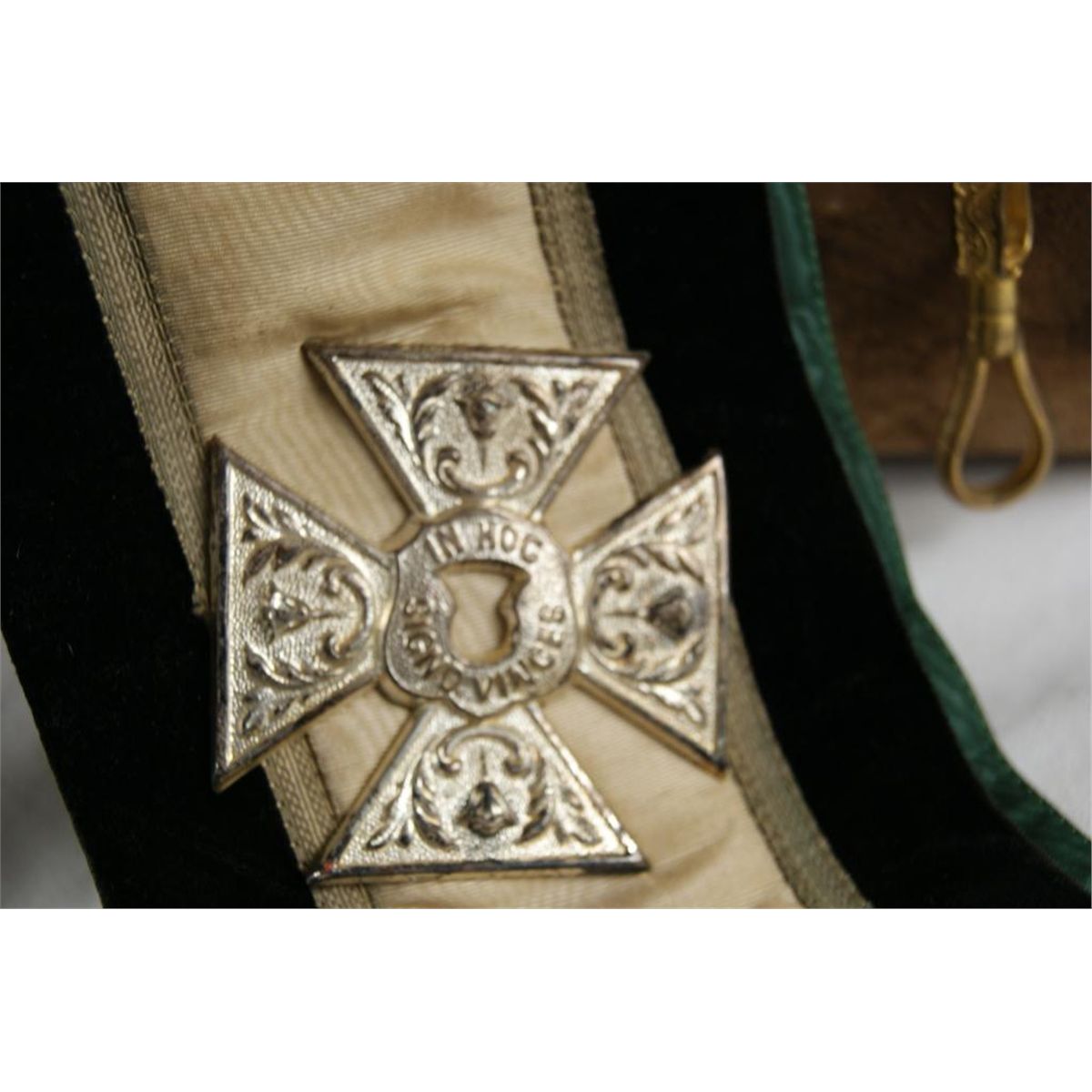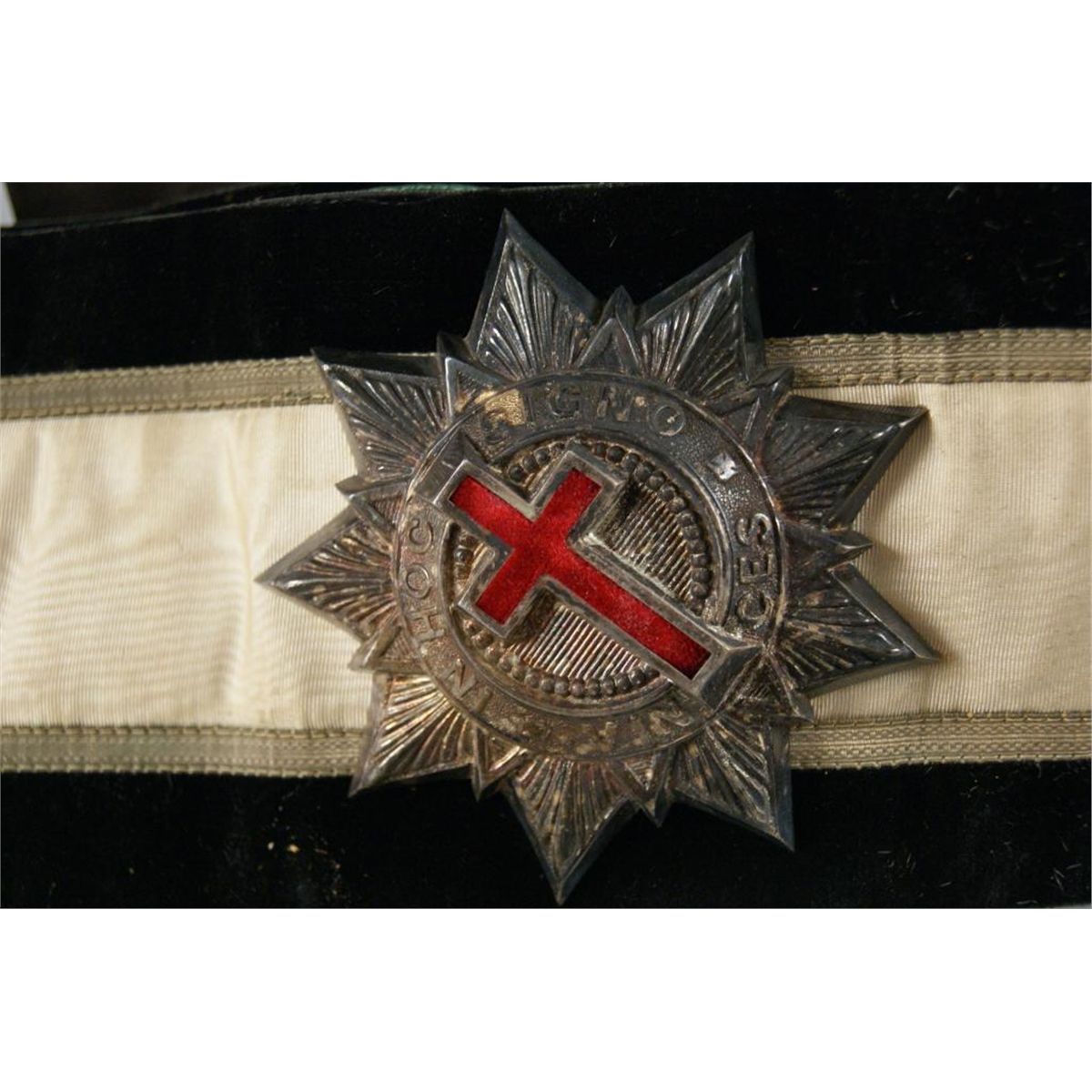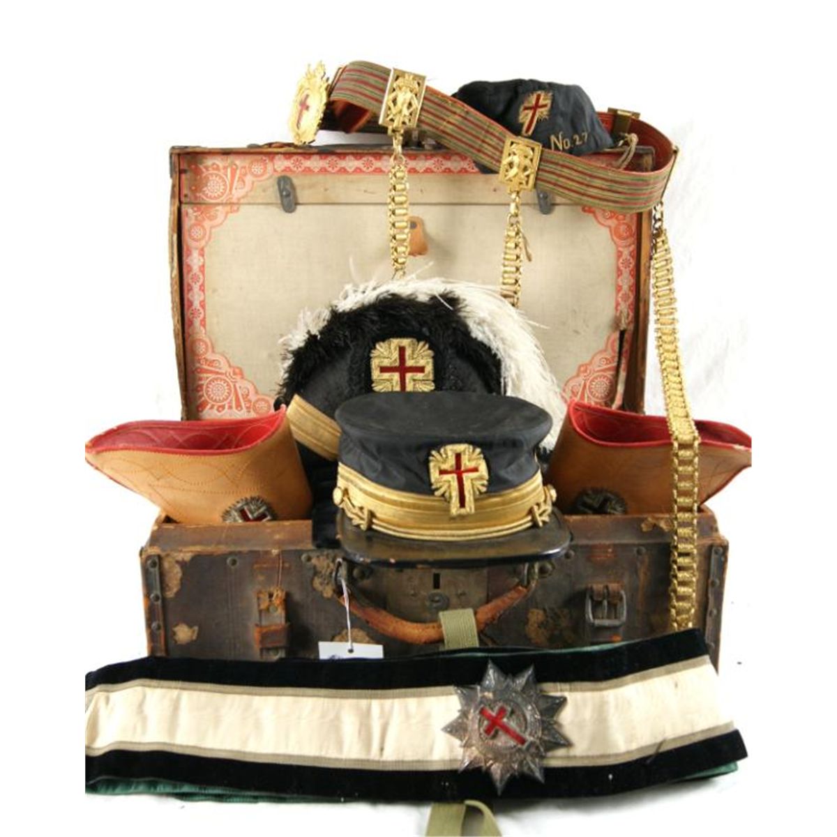 1 hat, 1 wide 'Cocked' hat, dress belt with gold chatelaine's, sash with Knights Templar insignia, matching arm cuffs circa 1900.