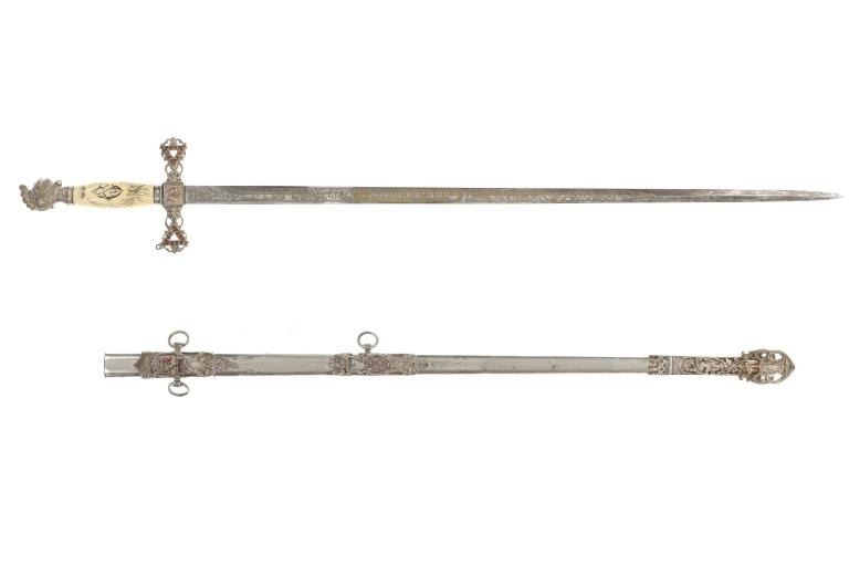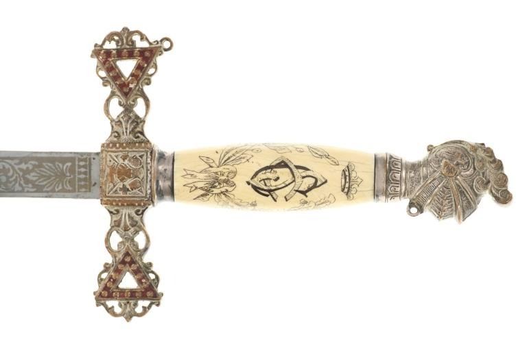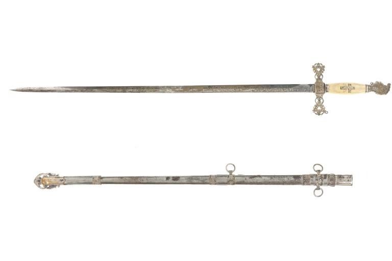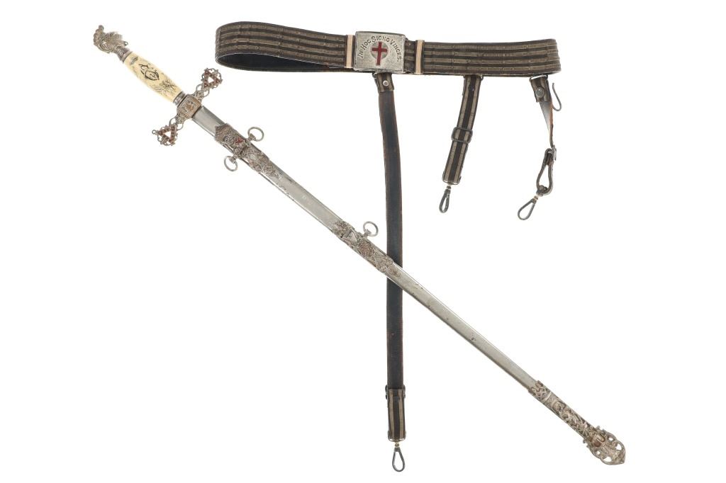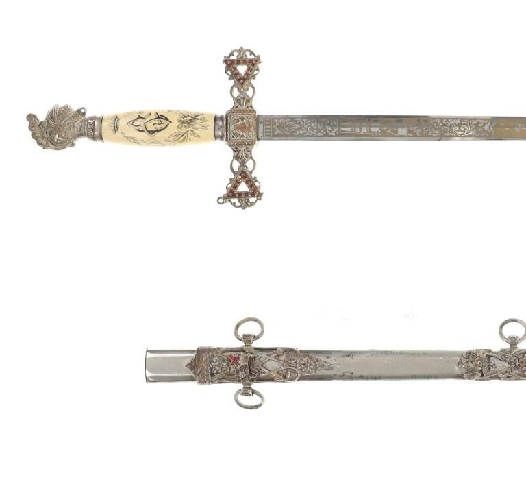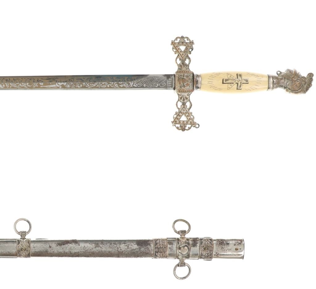 Featured in this lot is this Knights of Columbus Sam G. Calderhead ornate sword. The sword features a wonderfully and professionally crafted stainless steel, nickel and bone construction. The sword is full of Knights of Columbus traditional and ceremonial imagery with ricasso of the Knights Templar with Jeruselm in the background and gothic geometric patterns with a hilt with side ways triangles and shows the Hermetic Cross in a triangle on the hilt symbolizing the the Golden Dawn. The sword is marked on the blade and on the sheath as follows: Seattle Commandery No.2 - K.C. - Seattle - Wash. - Sam G. Calderhead - The Henderson Ames Co. - Kai Amazoo Mich. The condition of this Knights of Columbus sword is well preserved with with a slight patina adorning the blade and the sheath but otherwise is well preserved. The measurements of this sword in its sheath is 37 1/4" x 5 1/8" x 1" and the blade length is 29".