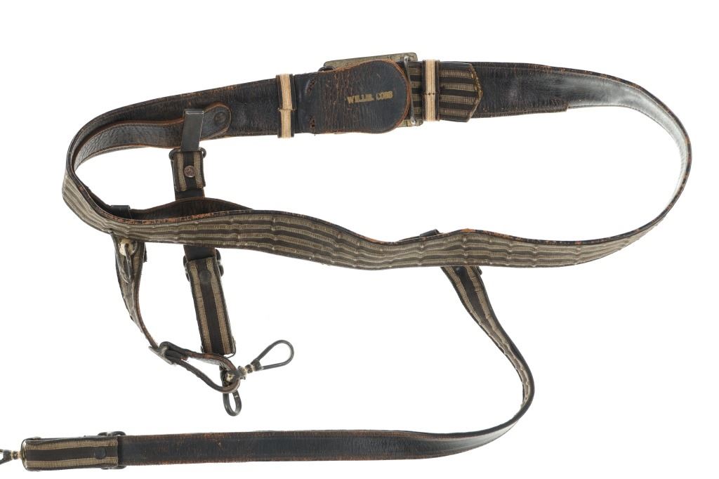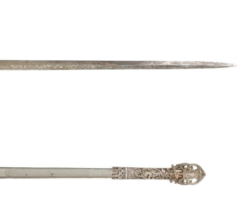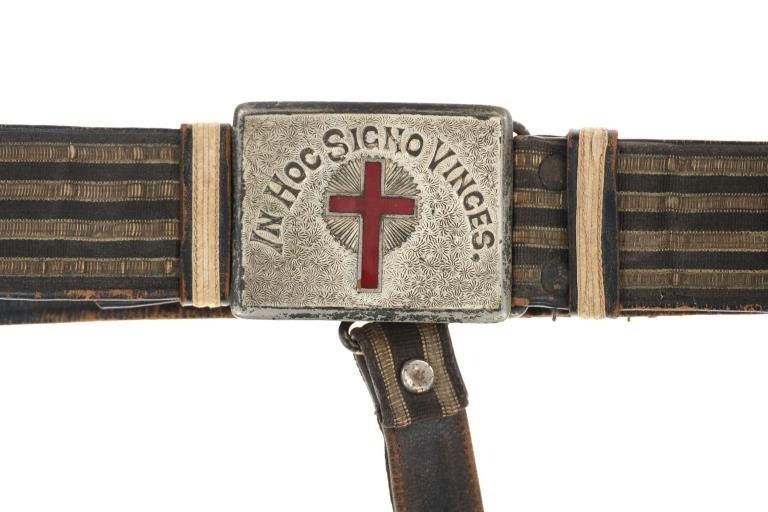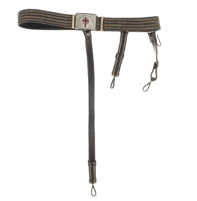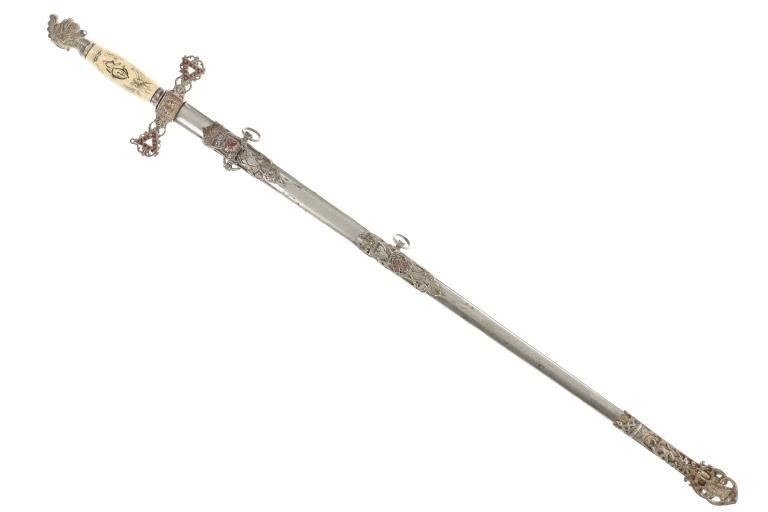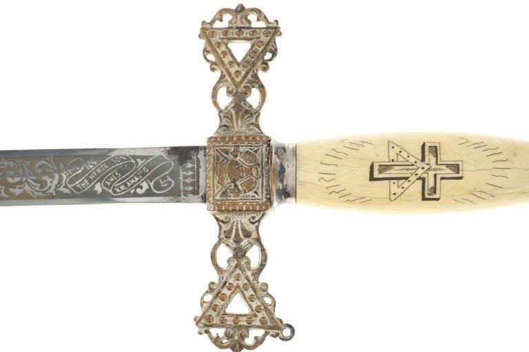 Featured in this lot is this Knights of Columbus Sam G. Calderhead ornate sword. The sword features a wonderfully and professionally crafted stainless steel, nickel and bone construction. The sword is full of Knights of Columbus traditional and ceremonial imagery with ricasso of the Knights Templar with Jeruselm in the background and gothic geometric patterns with a hilt with side ways triangles and shows the Hermetic Cross in a triangle on the hilt symbolizing the the Golden Dawn. The sword is marked on the blade and on the sheath as follows: Seattle Commandery No.2 - K.C. - Seattle - Wash. - Sam G. Calderhead - The Henderson Ames Co. - Kai Amazoo Mich. The condition of this Knights of Columbus sword is well preserved with with a slight patina adorning the blade and the sheath but otherwise is well preserved. The measurements of this sword in its sheath is 37 1/4" x 5 1/8" x 1" and the blade length is 29".