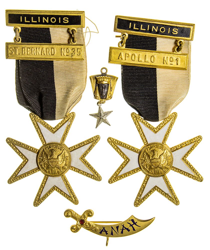Lot of 3. 1) Unknown state or chapter. Anah. No date. Ahah Membership Medal, very interesting and great detail. Anah runs their own Shriner Circus out of Maine. 2) Illinois. Apollo No. 1. No date. Knights of Malta Memebership Medal from Apollo #1 Commmadry in Iillinois. 3) Illinois. St. Bernard No. 35. No date. Membership Medal to Knights of Malta, Commandery of St Paul Illinois, a appellate organization to the York Rite. - HKA#65083