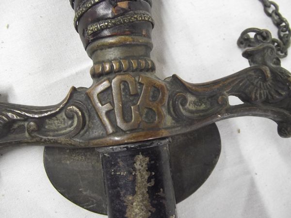 Knights of Pythias Ceremonial Sword & Scabbard. The symbol ''UR'' with the lily in the center stands for Uniform Ranks, Army of the Lilly. On the obverse side is ''FCB'' which stands for ''Friendship'', ''Charity'' and ''Benevolence''. The sword measures 40''. Engraved on the blade is the name of the owner which is hard to decipher. There is some condition issues on the wooden pommel but the piece has over-all great patina and displays beautifully.