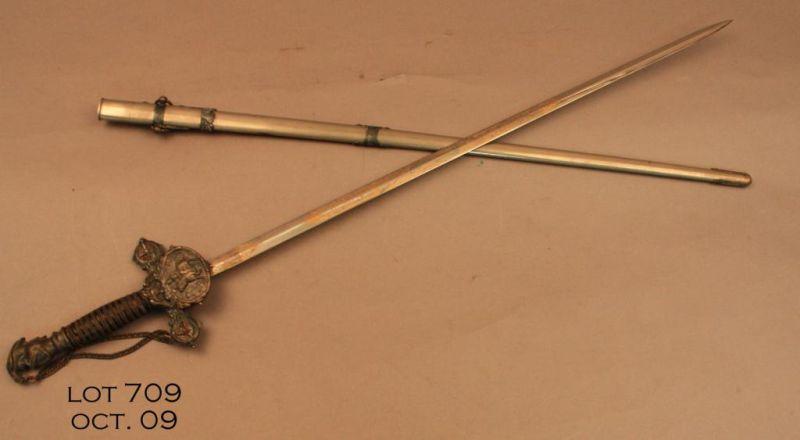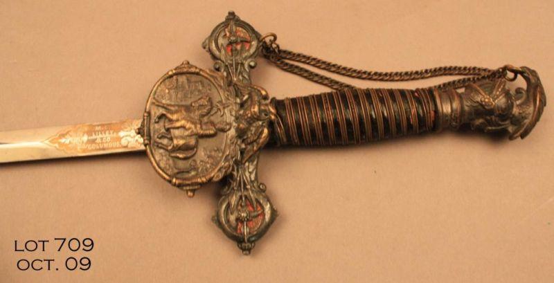 Knights of Pythias ceremonial sword and metal scabbard, approx. 37” overall. The sword is marked “M. C. Lilley & Co., Columbus” and is in overall very good condition; the blade is etched and has the name “Wm. M. Detweiler”; the cross guard,pommel and grip are nicely ornate as are the mountings on the nickeled scabbard. A far better-than-average ceremonial sword. Est.: $100-$200.