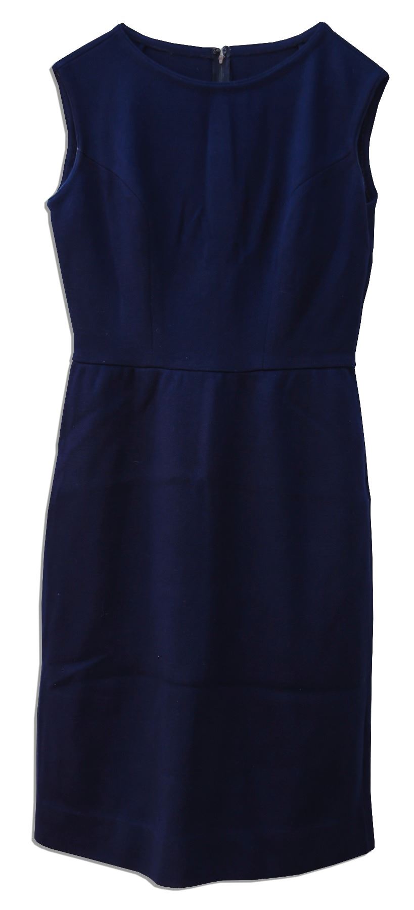 Knit dress owned and worn by the legendary actress Greta Garbo. The reclusive star was only 35 years old when she retired from acting in 1941 at the peak of her stardom. The navy blue sleeveless dress features a zipper closure to the back. Dress measures 17'' across the chest. Near fine. From the estate auction of Greta Garbo by Julien's Auctions.