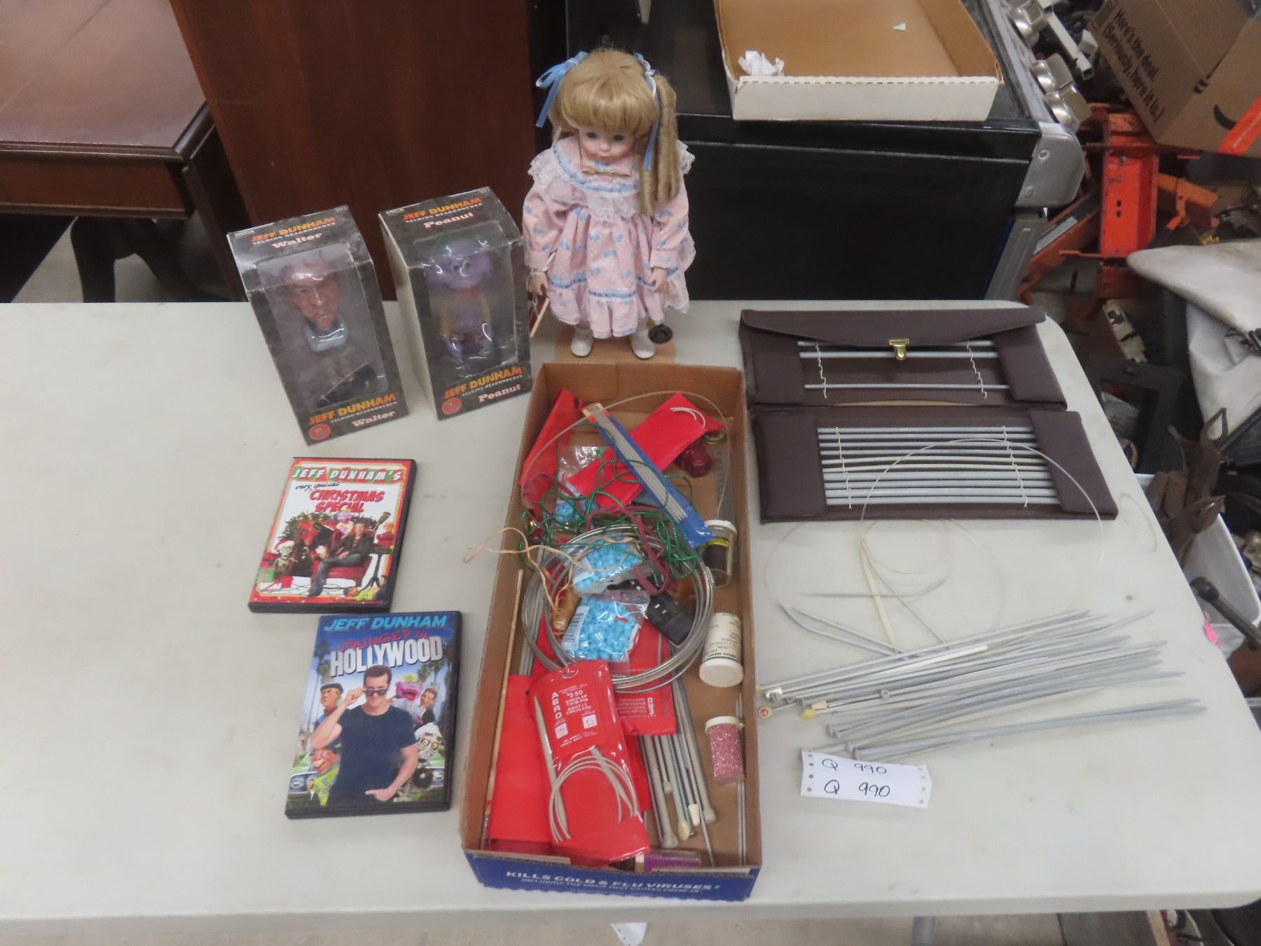 Knitting Needles; Porcelain Doll; Two DVDs; and Two Talking Head Knockers.