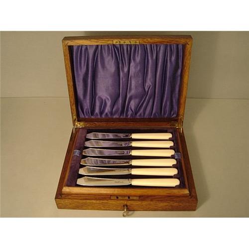 This is a fabulous set of 6 fish knives and forks, in sterling silver.They are English circa 1931. They have a great Art-deco design. The quality and condition of the box and cutlery are very good.The box even has the original key. The keyhole is missing the brass fitting, this is not very noticable. The lock functions , you can lock it. The cream bakelite handles are also perfect. This set would make a wonderful wedding gift! The knives and forks weigh including the handles 478 grms. ~ 16.9 ozs. The knives measure the following: Length: 8 ins. ~ 20.5 cm. Widest point: 1 ins. ~ 2.25 cm. The forks measure the following: Length: 6.75 ins. ~ 17 cm. Widest point: 0.75 ins. ~ 2 cm.