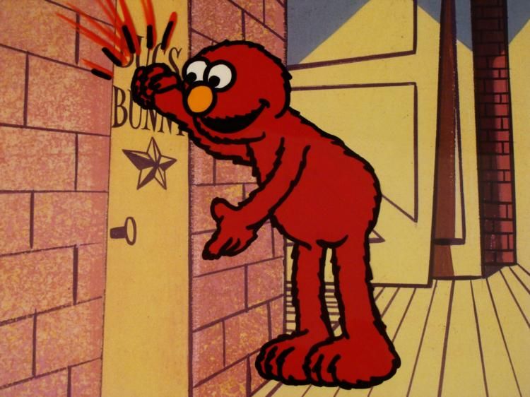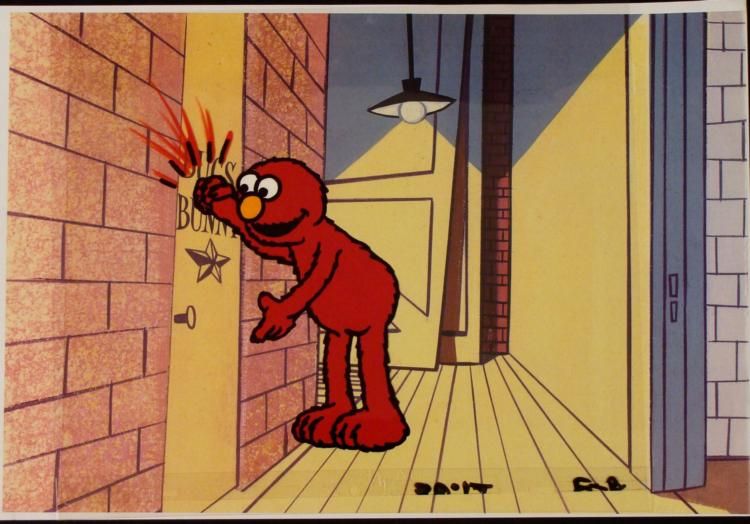 In Elmo's world everyone is happy and full of laughter. Elmo enjoys making friends and having a good time. In the cel, Elmo is knocking on Bugs Bunny's door * * * Original Animation Cel & Printed Background * * Medium: Hand painted acetate celDetails: Animation notations and peg holes * * Size of cel: 10 1/2 x 12 1/2 inchesSize of background: 11 x 17 inches * * Condition: Very good; slight tear on background * * * This is an original hand-painted cel set-up used in the production of an episode of "Sesame Street." Each one-of-a-kind set-up represents a slight change in position of the characters. When individually photographed and projected in rapid succession, the * images appear to move. * * To create production cels, the original animator's drawing is transferred onto an acetate cel (by hand-inking and/or photo copying). The cel is then hand-painted on the reverse side. The background accompanying this set-up is a printed reproduction background. * *