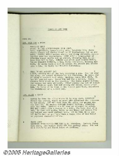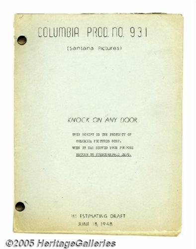 <B>"Knock On Any Door" Script.</B></I> Here is a vintage copy of the screenplay for the 1949 film noir "Knock On Any Door," which starred Humphrey Bogart as an attorney working to save a young client's life. The script is in very good condition with some mild creasing, tanning, and edge wear to the cover and supple, off-white pages.