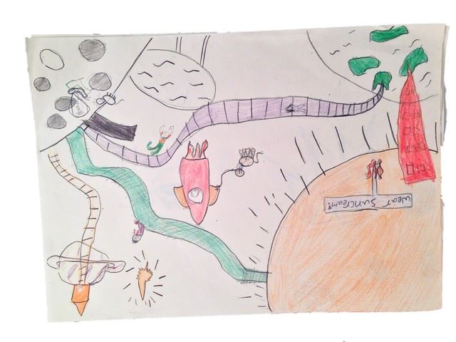 Hero, screen used, copies of children's drawings from the classroom, 6 total drawings. (approx16x12" each)
