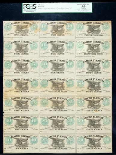 Knox Corners, NY - James C. Knox Uncut Remainder Sheet of 21 Notes. 5-10-25-50¢ Dec. 1, 1862. PCGS Choice About New 55 A. A lovely remainder sheet with an attractive eagle vignette at the center of each note. The Apparent grade was assigned due to stains and small edge nicks.