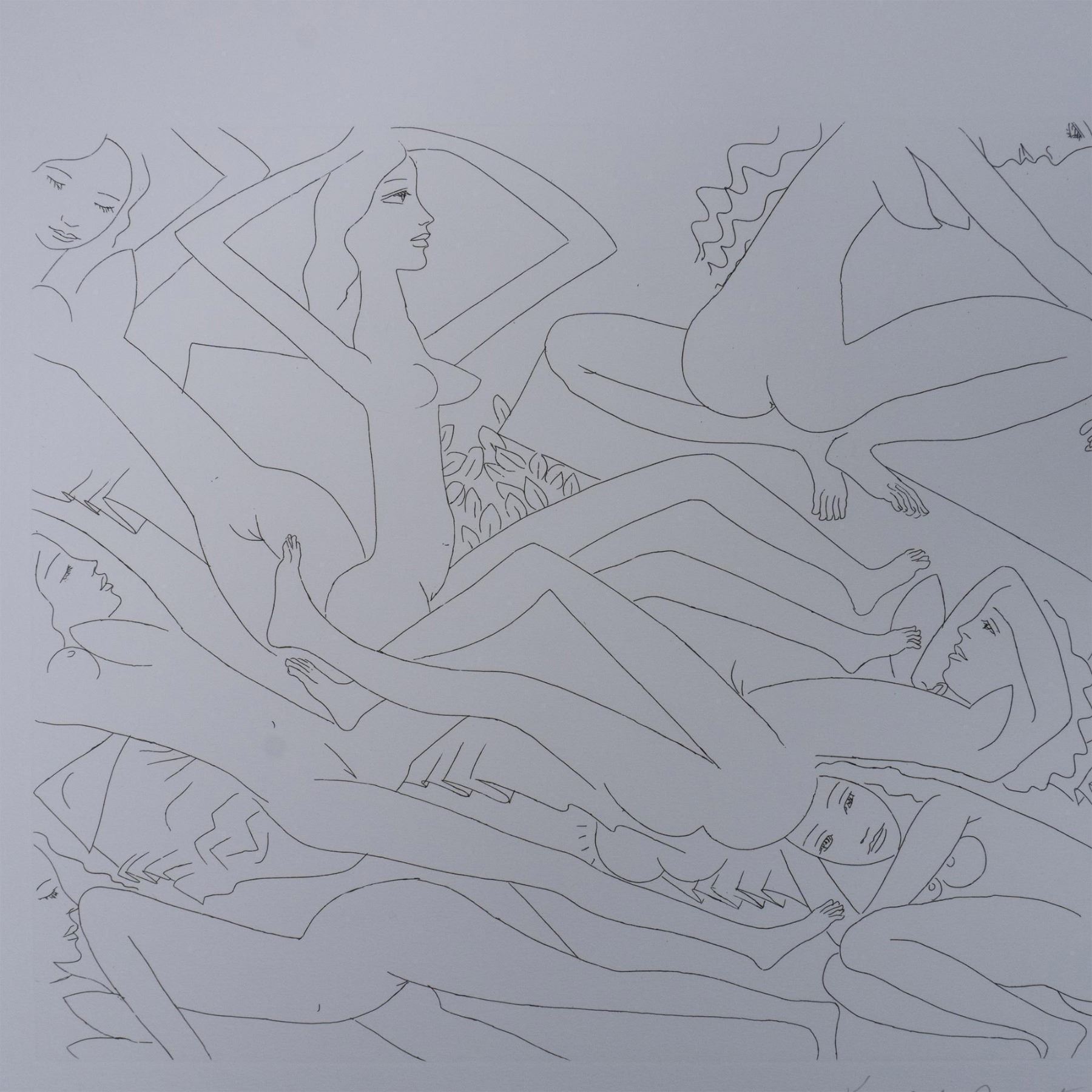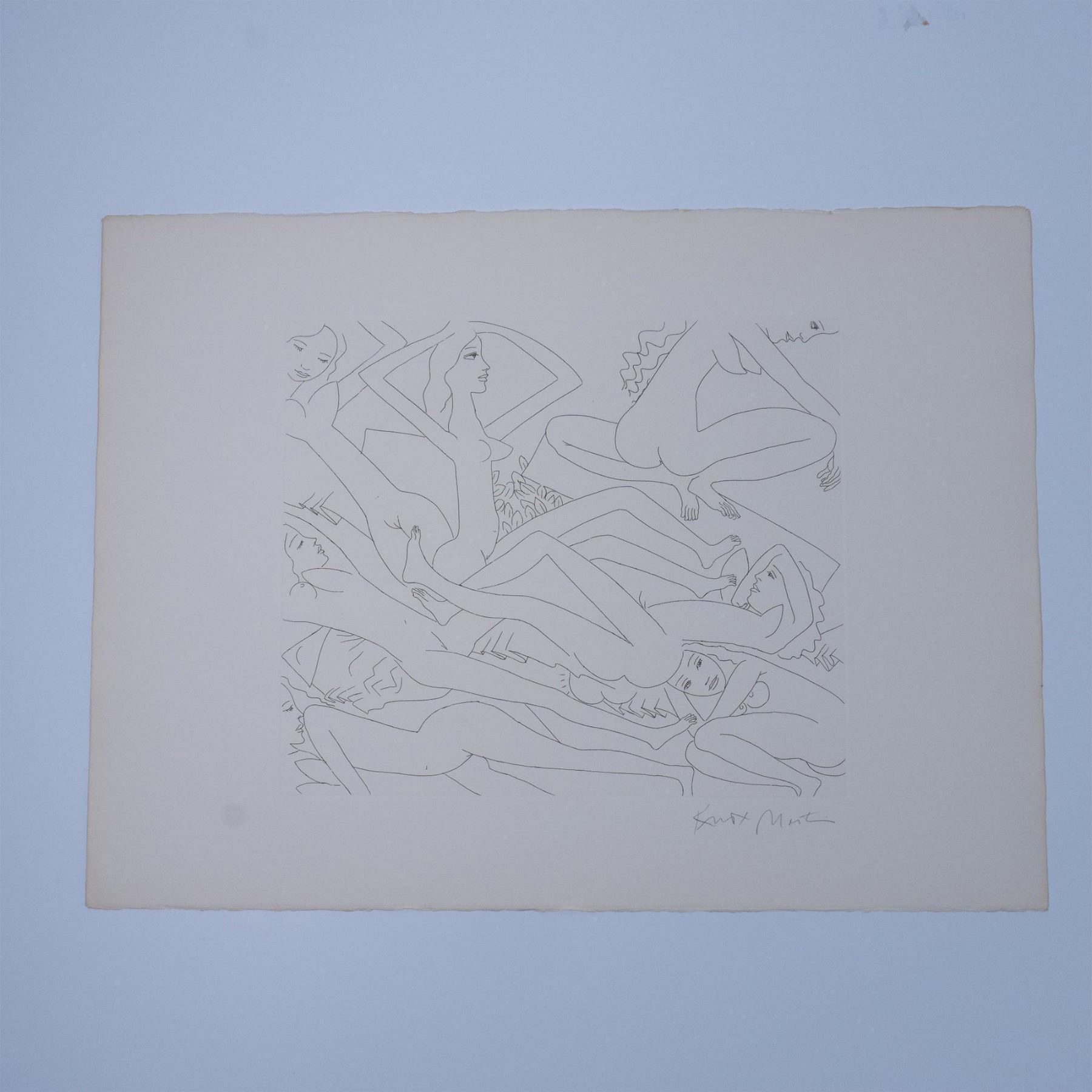 An original etching on Arches paper entitled Dancing Nudes II by American-Colombian artist Knox Martin. Artists signature in graphite on lower right: Knox Martin.