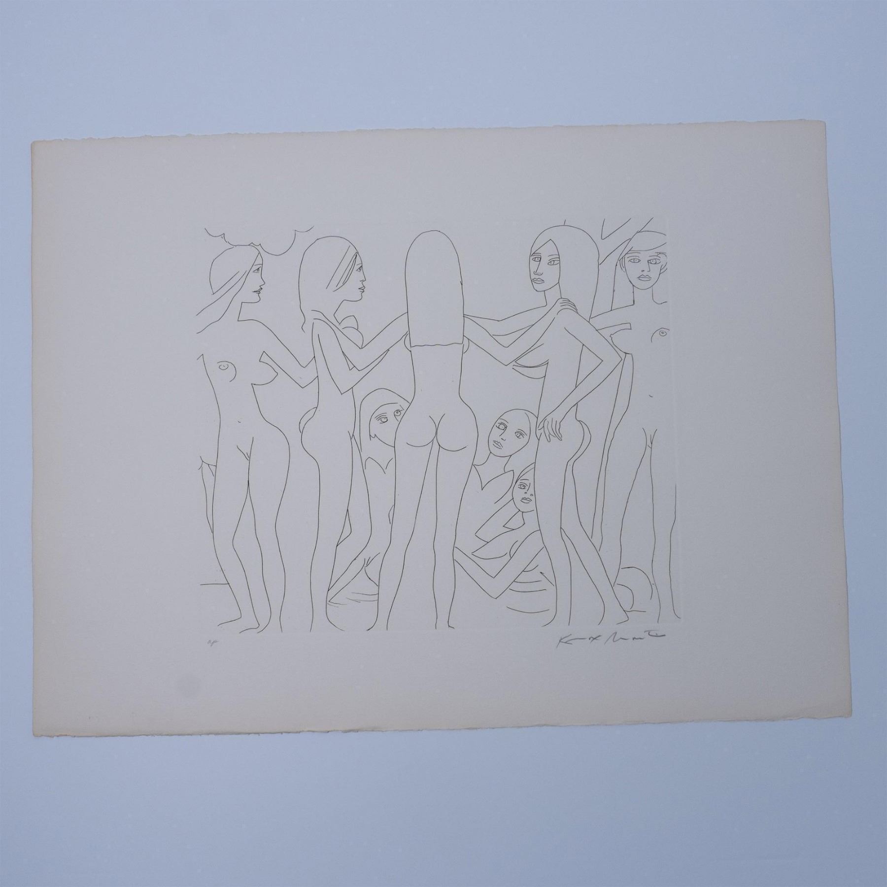 An original etching on Arches paper entitled Dancing Nudes III by American-Colombian artist Knox Martin. Part of a rare limited Artists Proof edition. Artists signature in graphite on lower right: Knox Martin. AP in graphite on lower left.