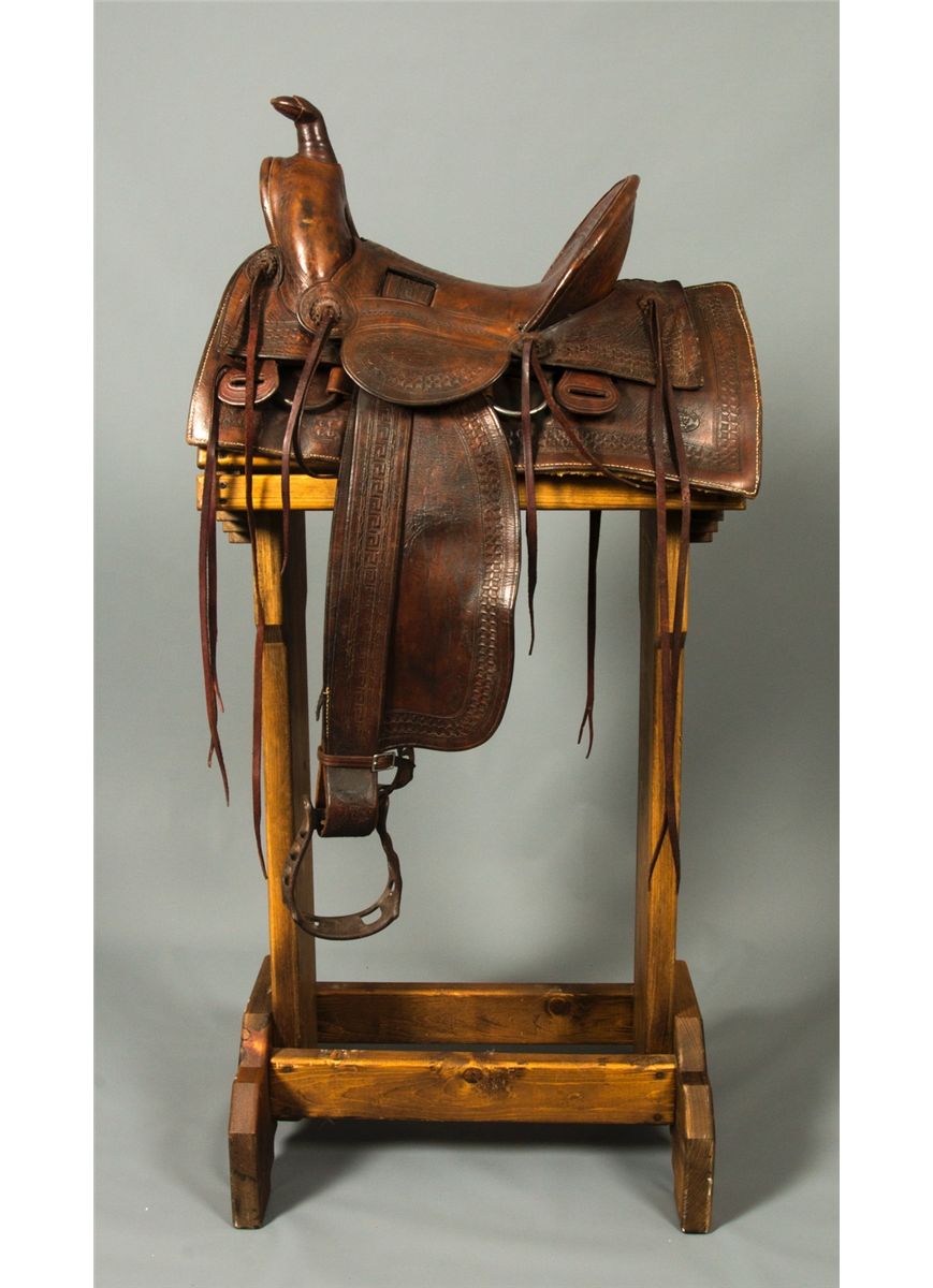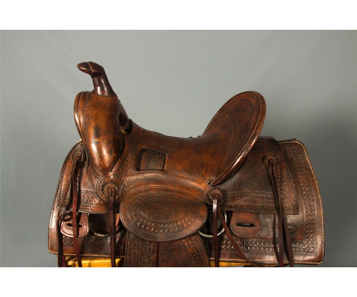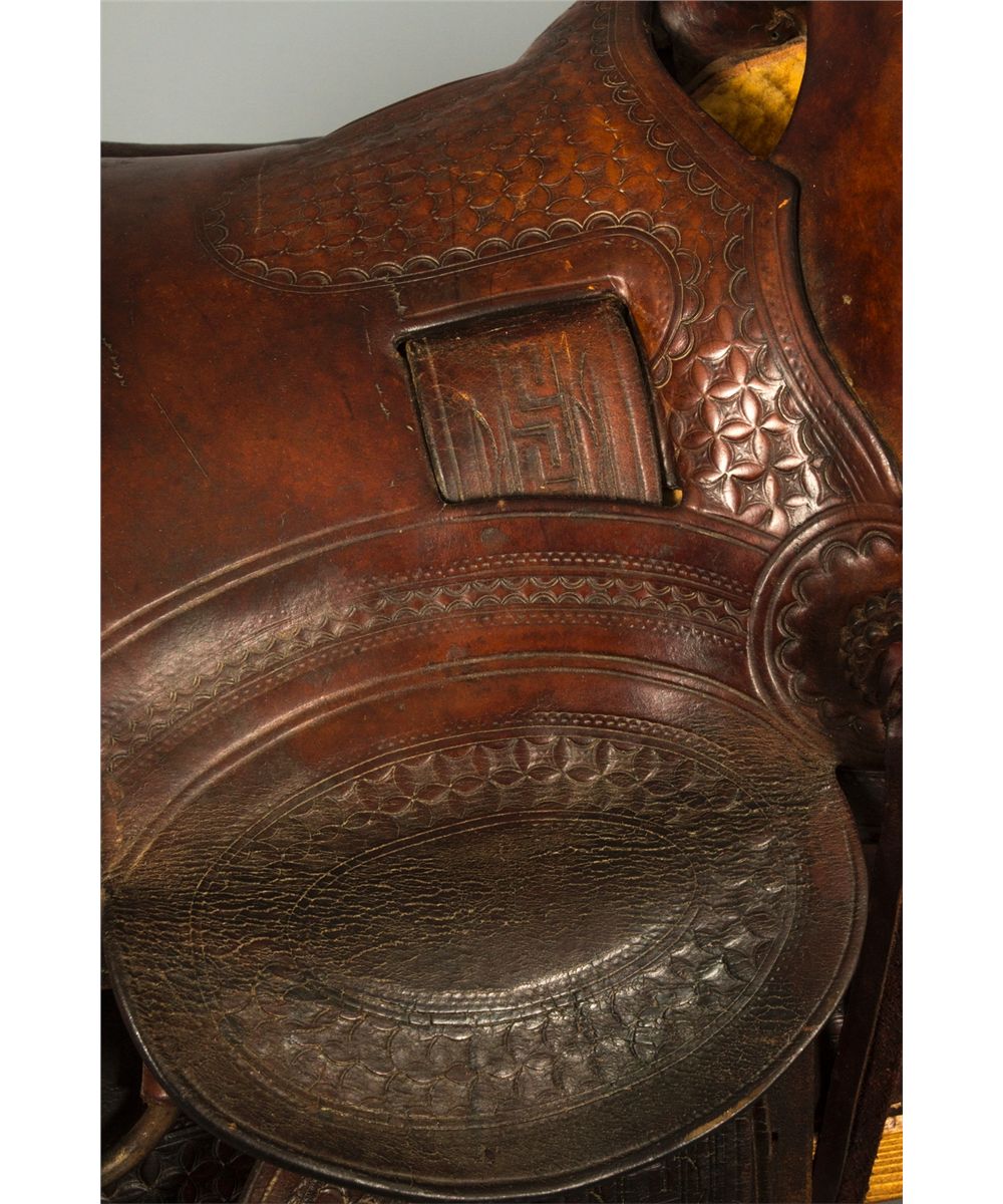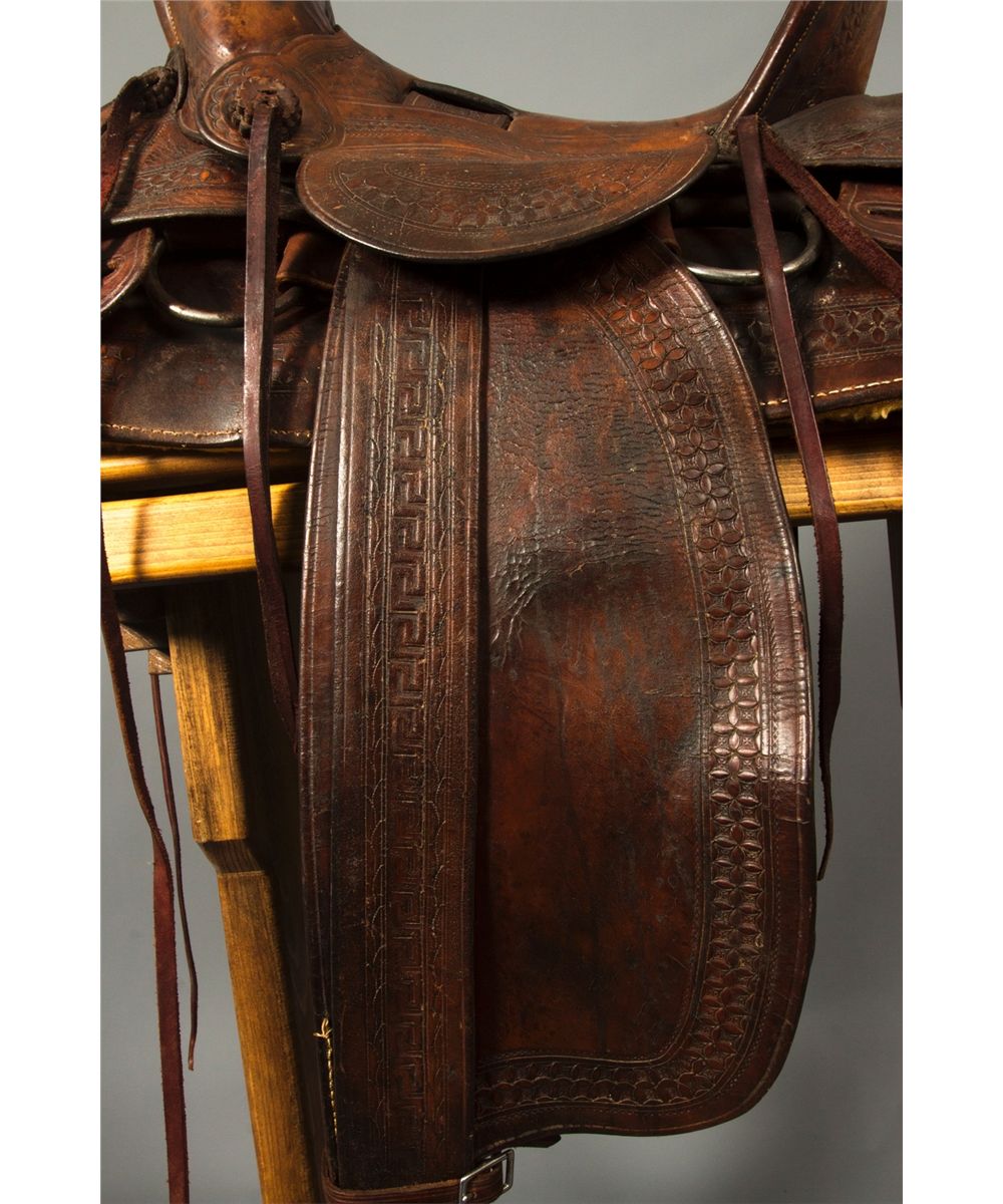 Knox and Tanner Co. (Rawlins, WY.) Saddle. 13.5" loop seat. Slick Fork. Floral tooled border. Greek key embossing on stirrups and leathers. Iron stirrups. Circa 1900. Provenance: Estate of Jim Nicholls.