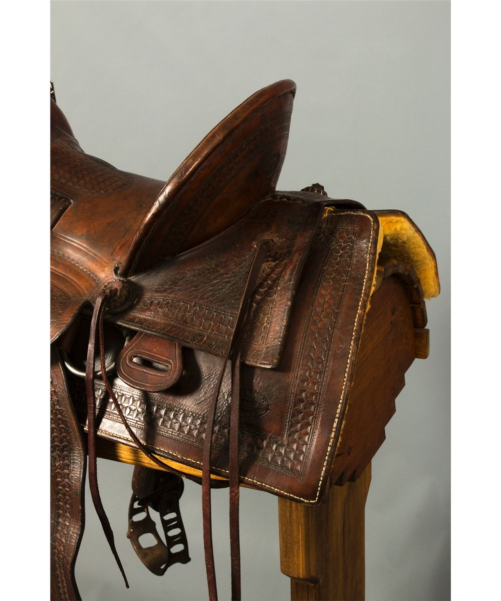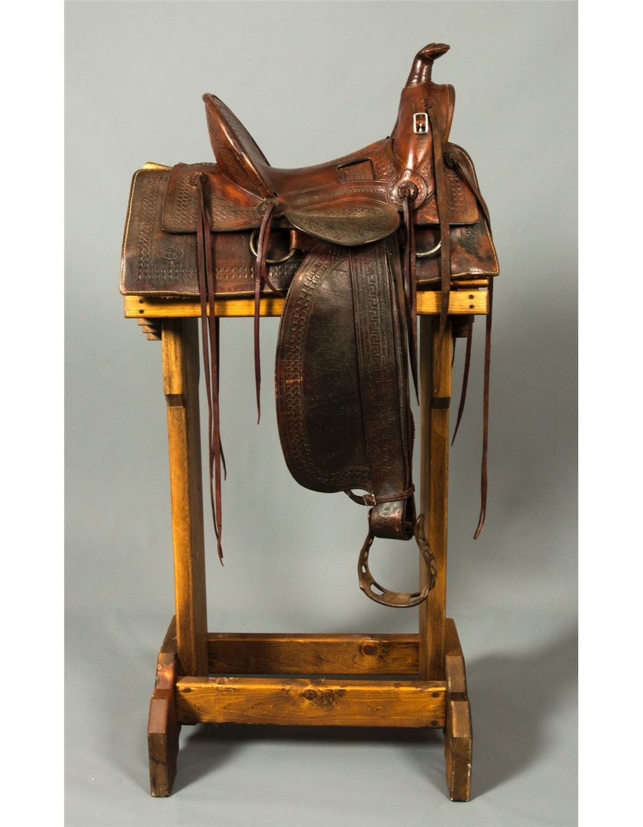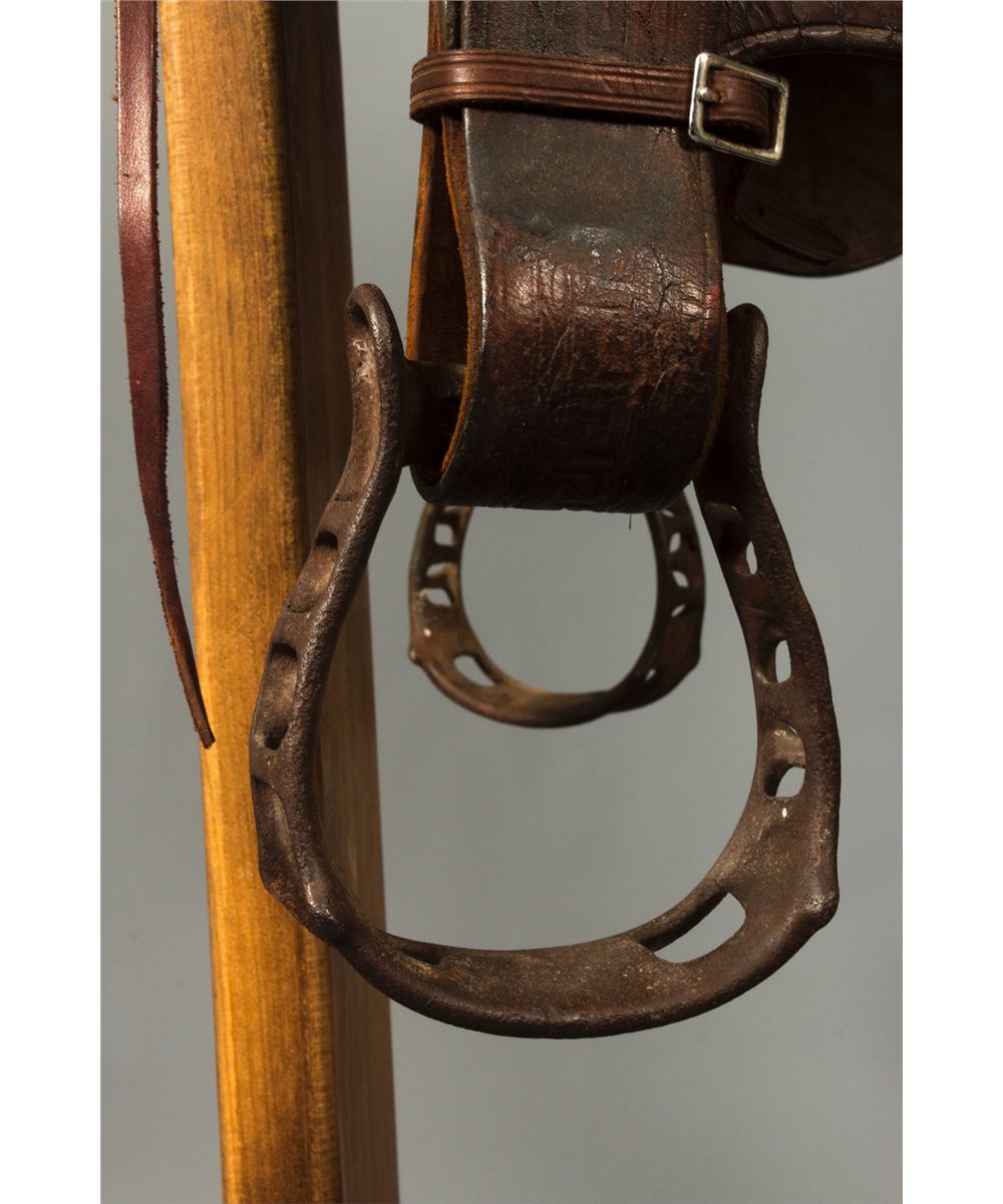 Knox and Tanner Co. (Rawlins, WY.) Saddle. 13.5" loop seat. Slick Fork. Floral tooled border. Greek key embossing on stirrups and leathers. Iron stirrups. Circa 1900. Provenance: Estate of Jim Nicholls.