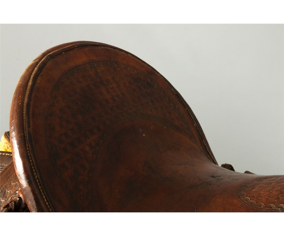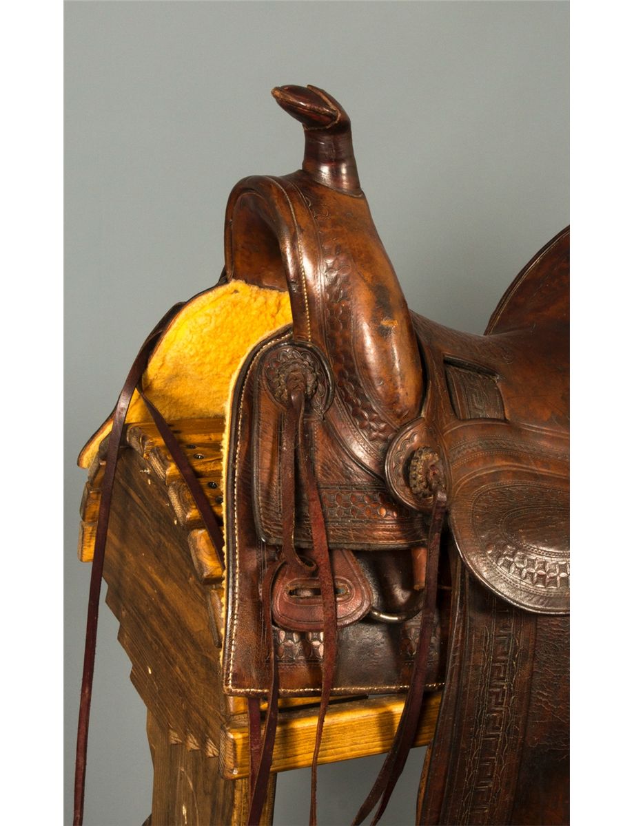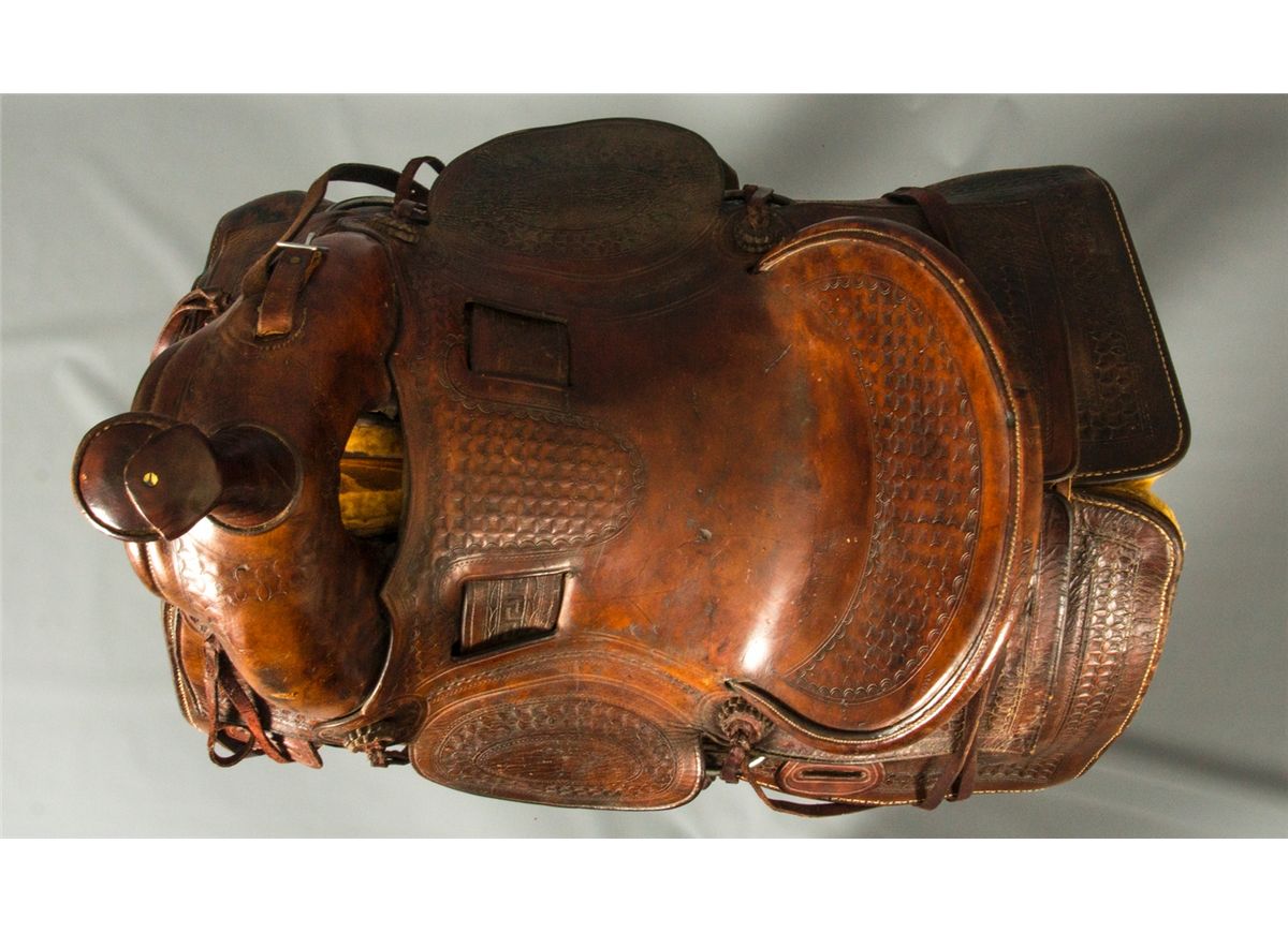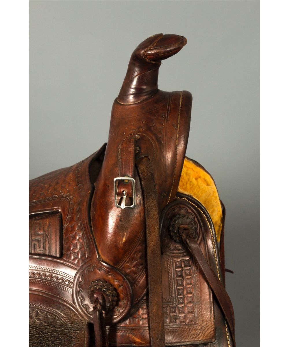 Knox and Tanner Co. (Rawlins, WY.) Saddle. 13.5" loop seat. Slick Fork. Floral tooled border. Greek key embossing on stirrups and leathers. Iron stirrups. Circa 1900. Provenance: Estate of Jim Nicholls.