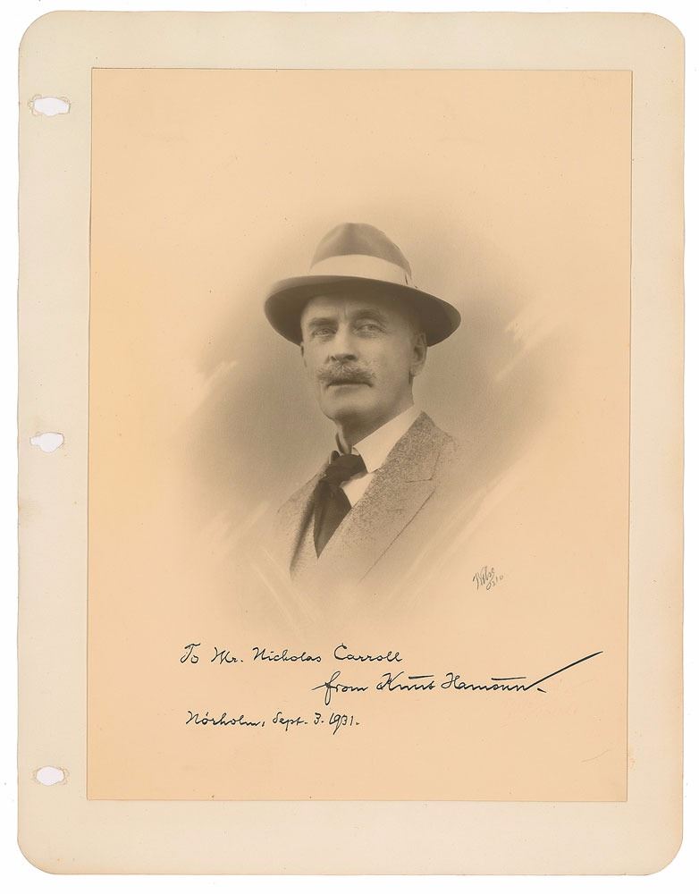 Norwegian writer (1859–1952), who was awarded the Nobel Prize in Literature in 1920. Best remembered for his works Hunger, Mysteries, Pan, Victoria, and his 'Nordland novels,' Hamson pioneered psychological literature with techniques of stream of consciousness and interior monologue, and influenced authors such as Thomas Mann, Franz Kafka, Maxim Gorky, Stefan Zweig, Henry Miller, Hermann Hesse, and Ernest Hemingway. Very desirable vintage matte-finish 7 x 9.25 photo of Hamson by the Wilse Studios of Oslo, signed and inscribed in black ink, "To Mr. Nicholas Carroll, from Knut Hamson, Norholm, Sept. 3. 1931.” Photo also signed by revered Norwegian photographer Anders Beer Wilse, whose studio blindstamp is present in the lower right. The photo is affixed to a slightly larger sheet. In fine to very fine condition. Accompanied by the front panel of the original mailing envelope, addressed in Hamson's own hand.