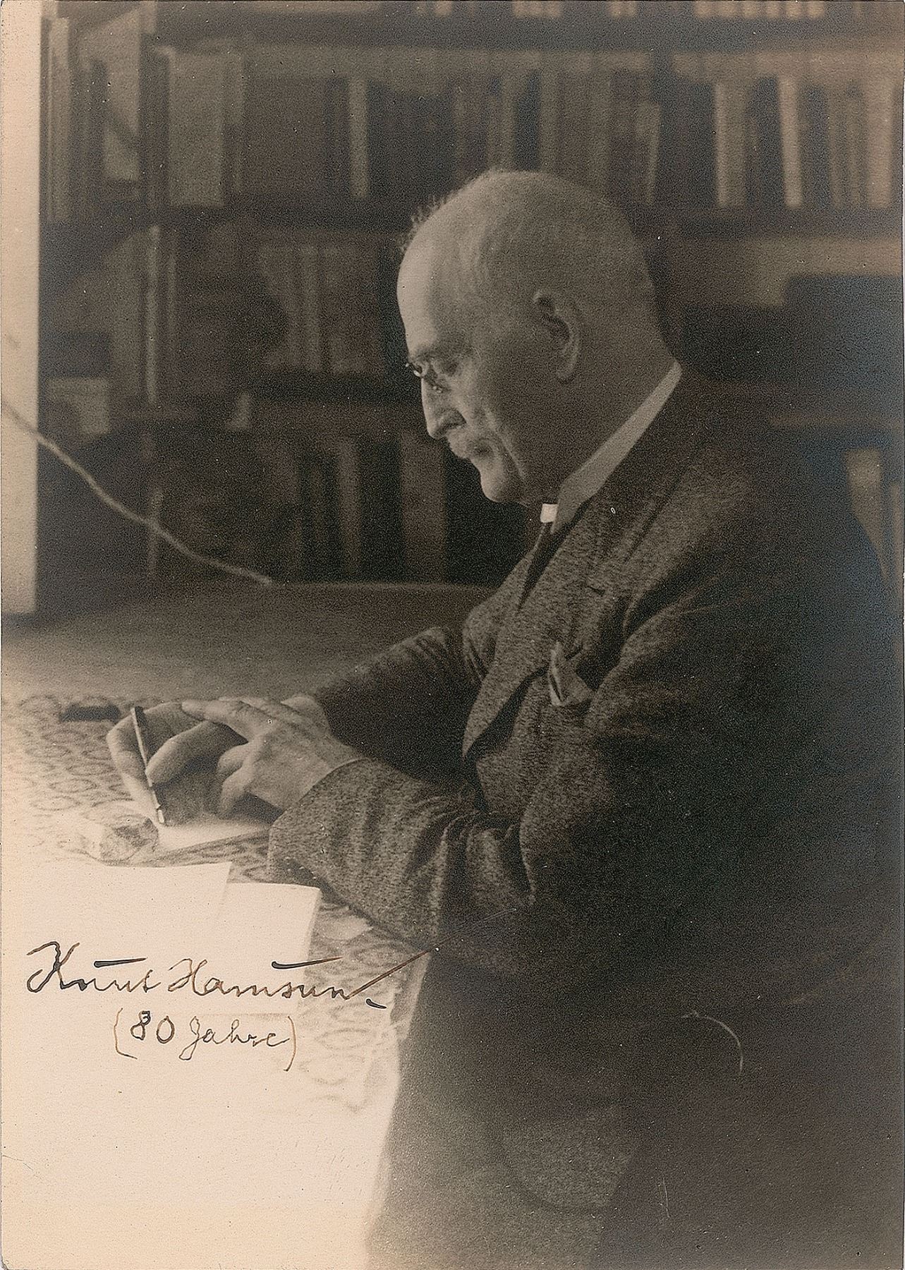 Norwegian writer (1859–1952), who was awarded the Nobel Prize in Literature in 1920. Best remembered for his works Hunger, Mysteries, Pan, Victoria, and his 'Nordland novels,' Hamson pioneered psychological literature with techniques of stream of consciousness and interior monologue, and influenced authors such as Thomas Mann, Franz Kafka, Maxim Gorky, Stefan Zweig, Henry Miller, Hermann Hesse, and Ernest Hemingway. Fantastic matte-finish 4 x 5.5 photo of Hamsun writing at his desk, neatly signed in fountain pen, "Knut Hamsun, (80 Jahre)," signifying that he was 80 years old. In fine condition, with light silvering to the darker areas of the image.