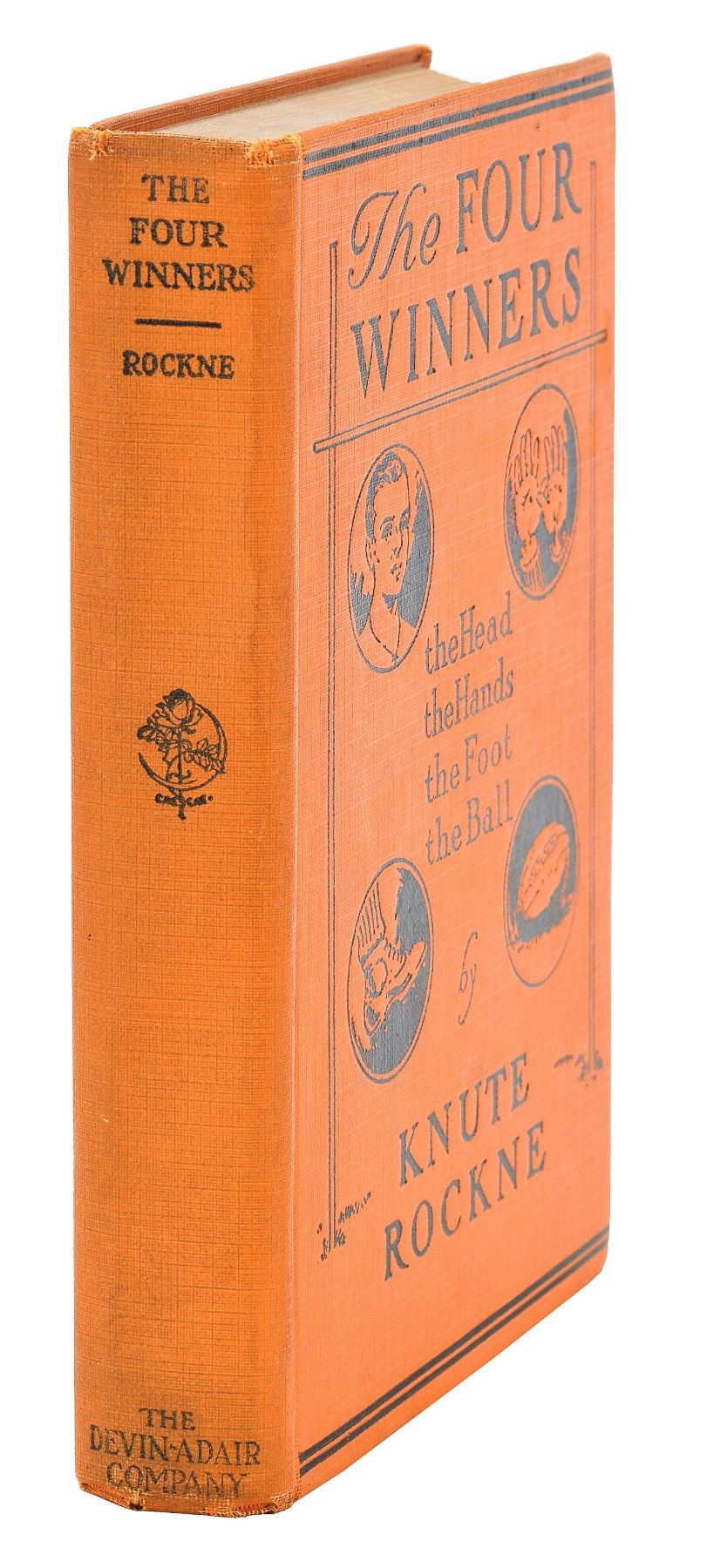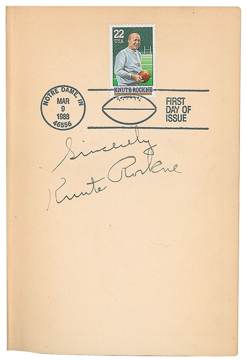 Fabled college football coach (1888–1931). Rockne not only made Notre Dame the country’s leading football center, but also revolutionized football theory, stressing offense, organizing the precision backfield of the Notre Dame shift, perfecting line play, and developing many stars, including the most famous backfield of all time, the 'Four Horsemen of Notre Dame.' He died in a plane crash at the age of forty-three. Signed book: The Four Winners. NY: Devin-Adair Company, 1925. Hardcover, 5.25 x 7.5, 251 pages. Signed on the first free end page in fountain pen, “Sincerely, Knute Rockne.” The signed page also bears a 22-cent Rockne postage stamp, as well as a "First Day of Issue" cancellation from March 9, 1988, at Notre Dame. In fine condition, with scattered light soiling to covers, mild sunning to spine, and a couple water spots to ends of pages. A most uncommon format for the ever-elusive Rockne!
