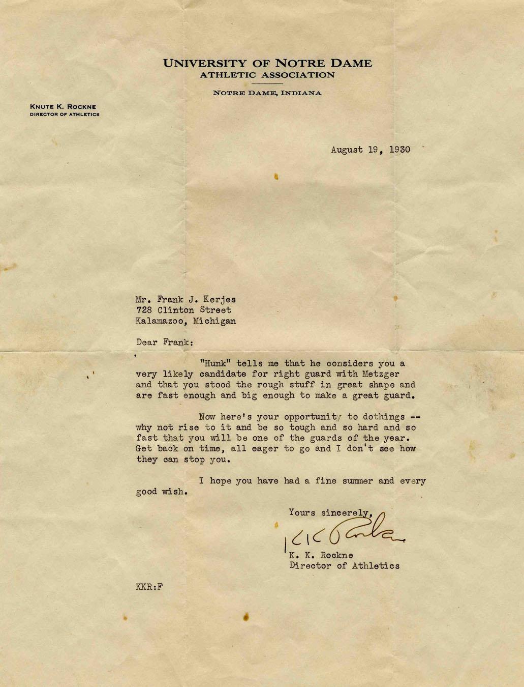 Knute Rockne typed letter signed on University of Notre Dame Athletic Association letterhead, to player Frank Kerjez dated 19 August 1930. Lively and encouraging text reads in full: ''Dear Frank: ''Hunk tells me that he considers you a very likely candidate for right guard with Metzger and that you stood the rough stuff in great shape and are fast enough and big enough to make a great guard. How here's your opportunity to do things--why not rise to it and be so tough and so hard and so fast that you will be one of the guards of the year. Get back on time, all eager to go and I don't see how they can stop you. I hope you have had a fine summer and every good wish. Yours sincerely, K.K. Rockne / Director of Athletics.'' Measures 8.5'' x 11''. Mailing folds, age toning and some creasing; very good condition.