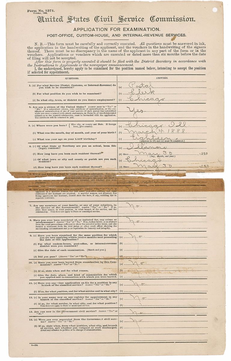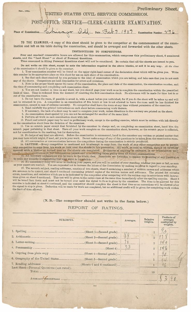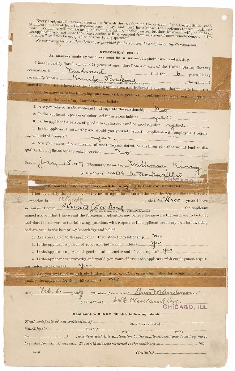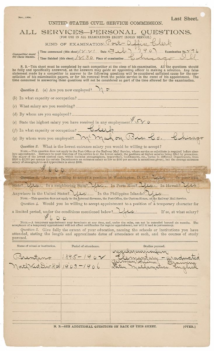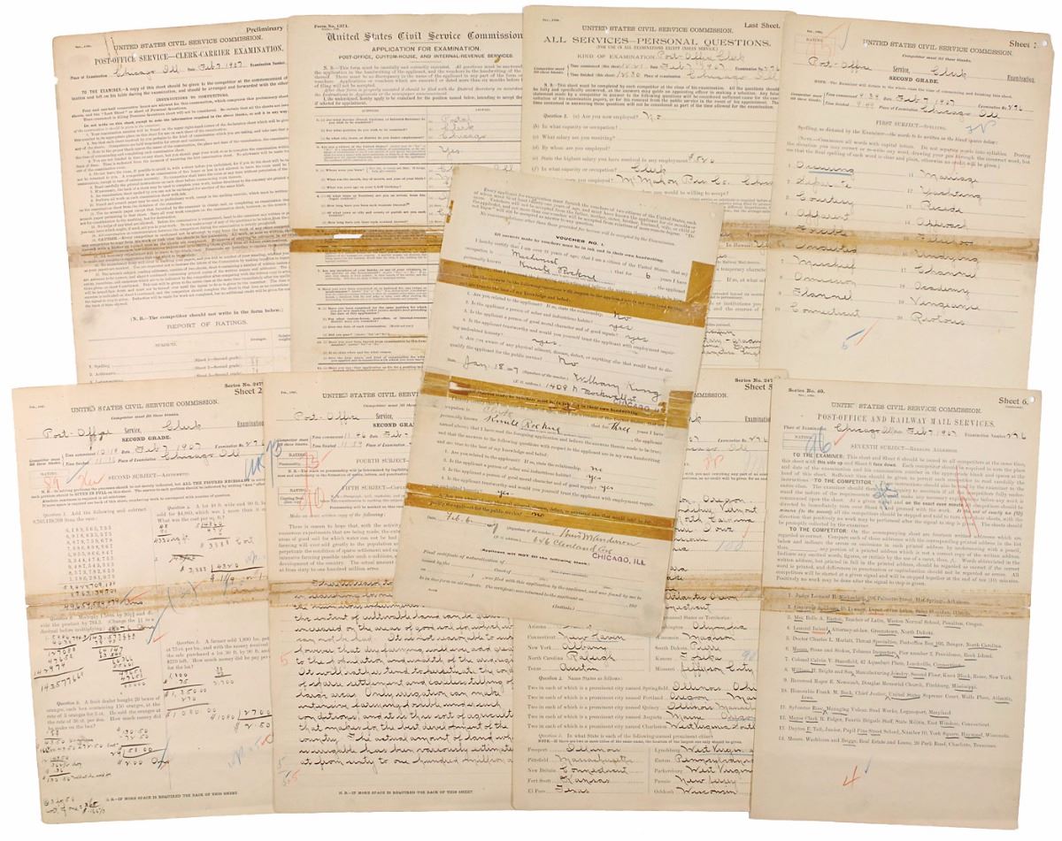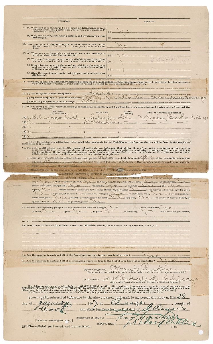Postal examination application and exam filled out and taken by the then 19-year-old Rockne. Included are the notarized two-page 8.5 x 14 Civil Service examination application, dated January 28, 1907, filled out and signed twice by Rockne, who answers over 30 questions regarding his personal history and background, including his age, birthplace, residence, current occupation “clerk,” current salary “$520,” and his health record. Signed at the conclusion, “Knute Rockne,” adding his mailing address underneath. The second page of the application bears two personal vouchers, filled out by acquaintances of Rockne attesting to his information and character; this page is also signed on the docket by Rockne, adding several other lines of information. Also included is Rockne’s seven page Post Office Service Clerk-Carrier Examination, given on February 7, 1907, completely filled out in Rockne’s hand, with the third page not present. First page bears printed instructions, with Rockne’s individual section scores listed at the bottom, as well as his total average percentage as “83.90.” The exam consisted of a 20-word spelling test, five math problems, a penmanship test for which he wrote a 17-line paragraph, a geography test, and an assessment of his ability to read addresses. The final page consists of personal questions regarding potential employment, where he requests a salary of $600. Old tape repairs to central horizontal folds, scattered toning, pencil notations and marks to pages, paper loss to application, punch hole to each top corner, and moderate handling wear, otherwise very good condition. Before he became college football’s ‘most-renowned coach,’ Rockne—at his father’s urging—applied for this job as a postal clerk. The results of this offered examination were good enough to earn him his $600 asking price beginning in March 1907. By age 22, with his pay now at $1,000, he had saved enough money to leave Chicago and head to South Bend, Indiana.