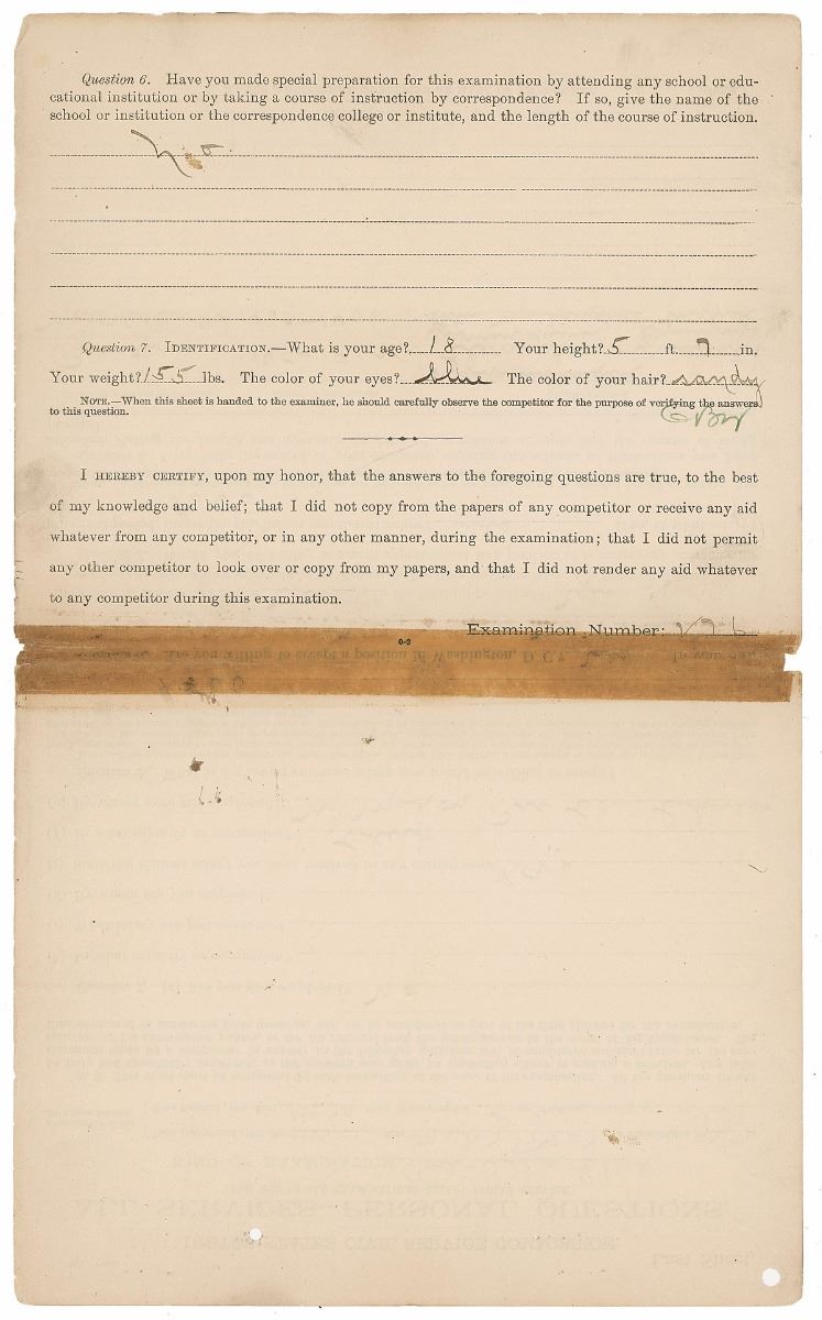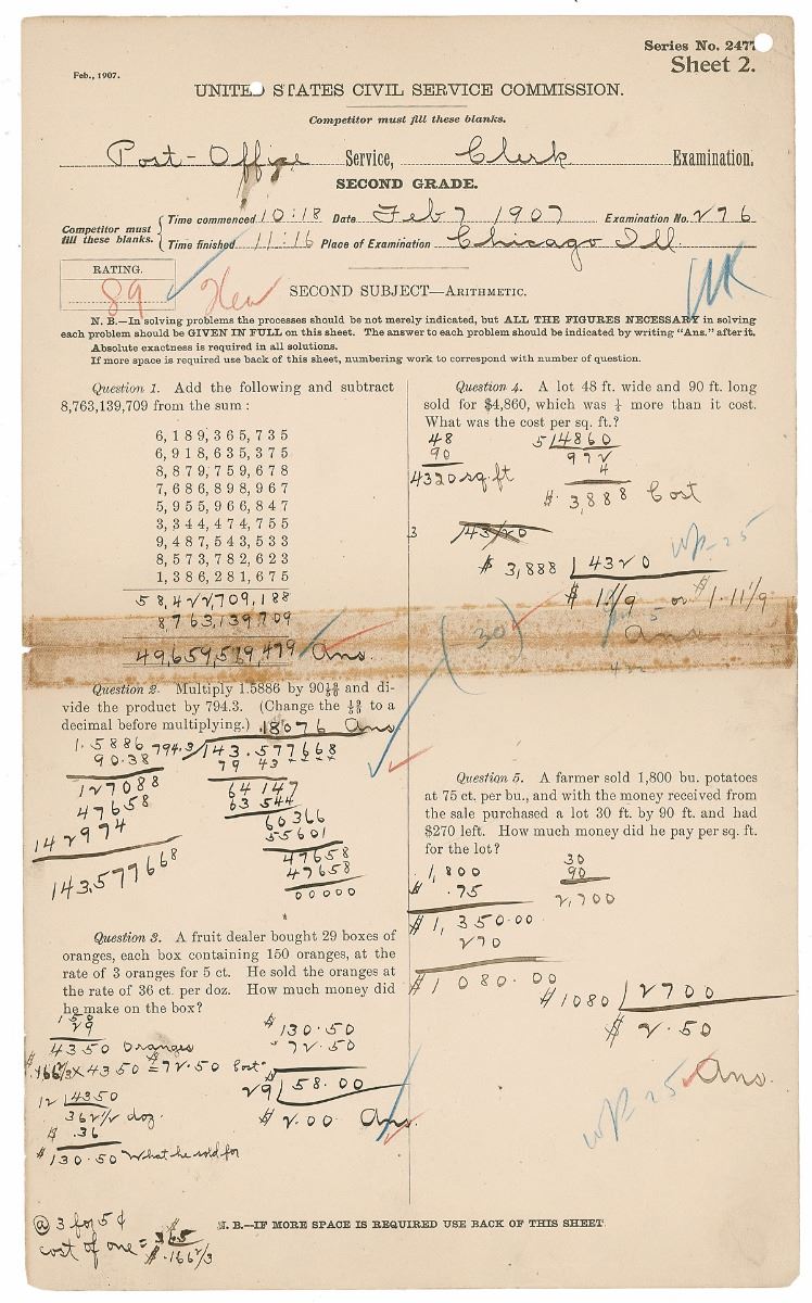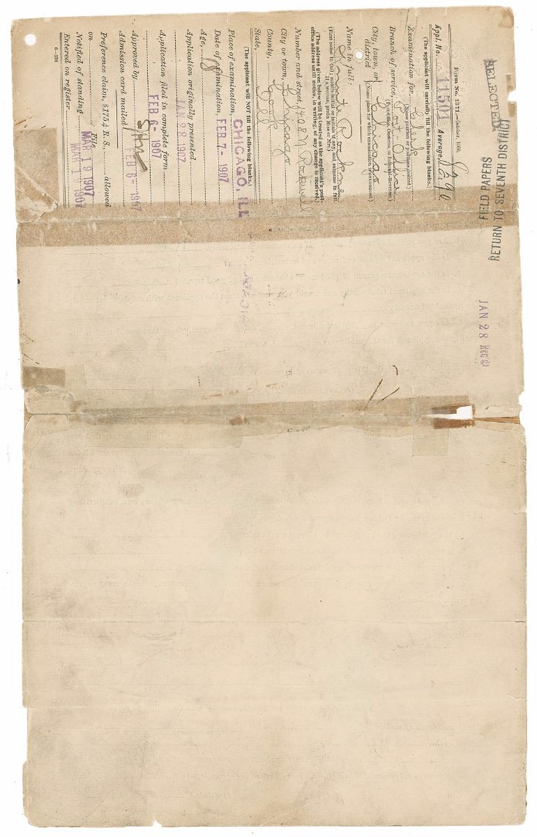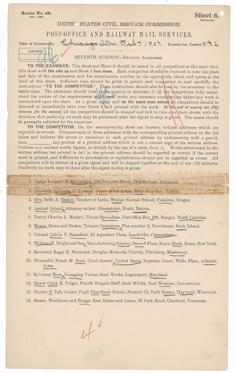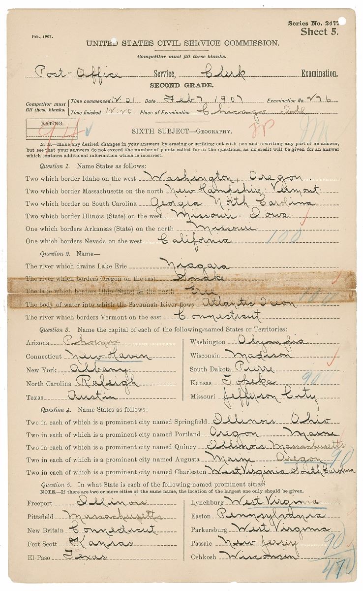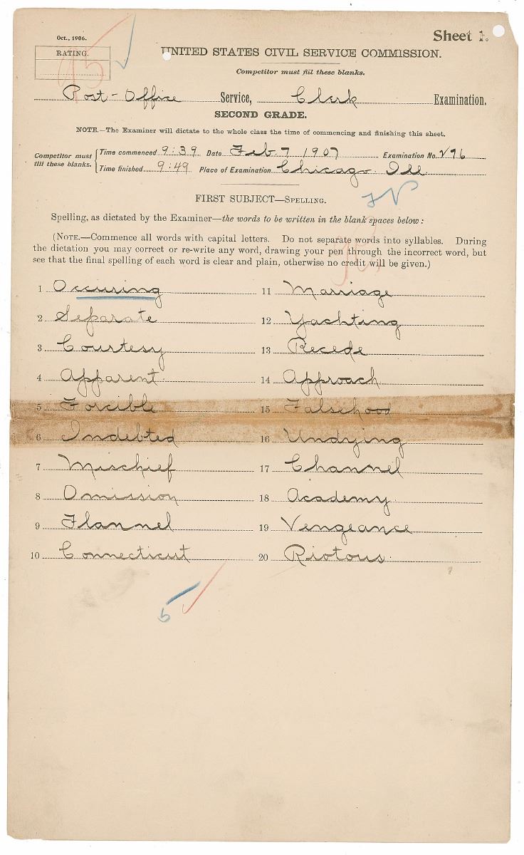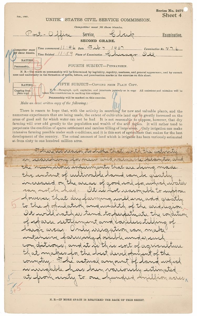 Postal examination application and exam filled out and taken by the then 19-year-old Rockne. Included are the notarized two-page 8.5 x 14 Civil Service examination application, dated January 28, 1907, filled out and signed twice by Rockne, who answers over 30 questions regarding his personal history and background, including his age, birthplace, residence, current occupation “clerk,” current salary “$520,” and his health record. Signed at the conclusion, “Knute Rockne,” adding his mailing address underneath. The second page of the application bears two personal vouchers, filled out by acquaintances of Rockne attesting to his information and character; this page is also signed on the docket by Rockne, adding several other lines of information. Also included is Rockne’s seven page Post Office Service Clerk-Carrier Examination, given on February 7, 1907, completely filled out in Rockne’s hand, with the third page not present. First page bears printed instructions, with Rockne’s individual section scores listed at the bottom, as well as his total average percentage as “83.90.” The exam consisted of a 20-word spelling test, five math problems, a penmanship test for which he wrote a 17-line paragraph, a geography test, and an assessment of his ability to read addresses. The final page consists of personal questions regarding potential employment, where he requests a salary of $600. Old tape repairs to central horizontal folds, scattered toning, pencil notations and marks to pages, paper loss to application, punch hole to each top corner, and moderate handling wear, otherwise very good condition. Before he became college football’s ‘most-renowned coach,’ Rockne—at his father’s urging—applied for this job as a postal clerk. The results of this offered examination were good enough to earn him his $600 asking price beginning in March 1907. By age 22, with his pay now at $1,000, he had saved enough money to leave Chicago and head to South Bend, Indiana.