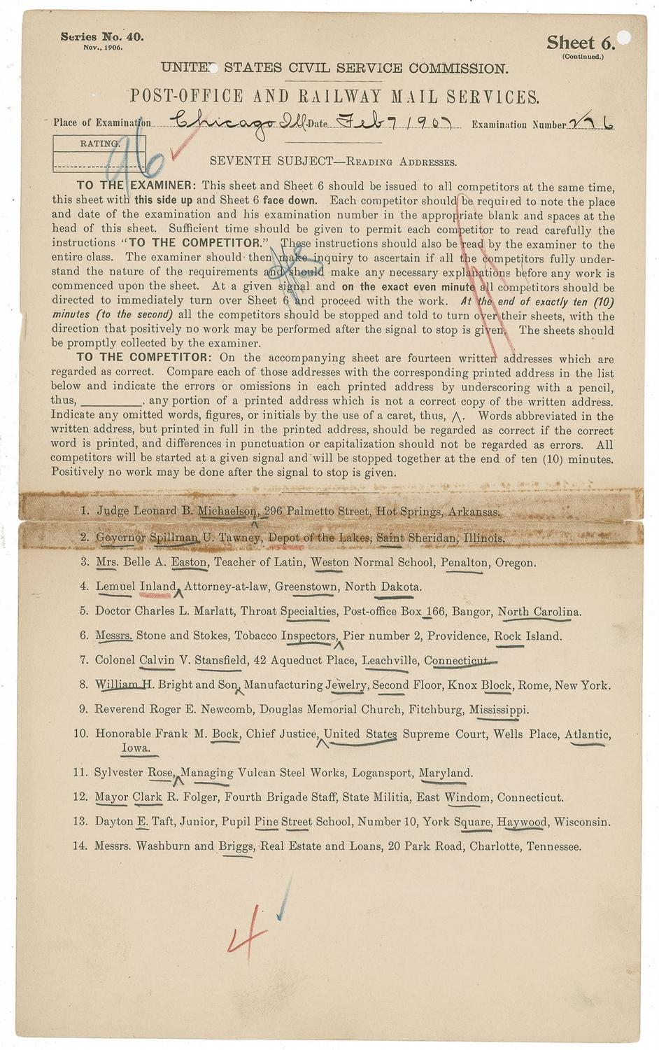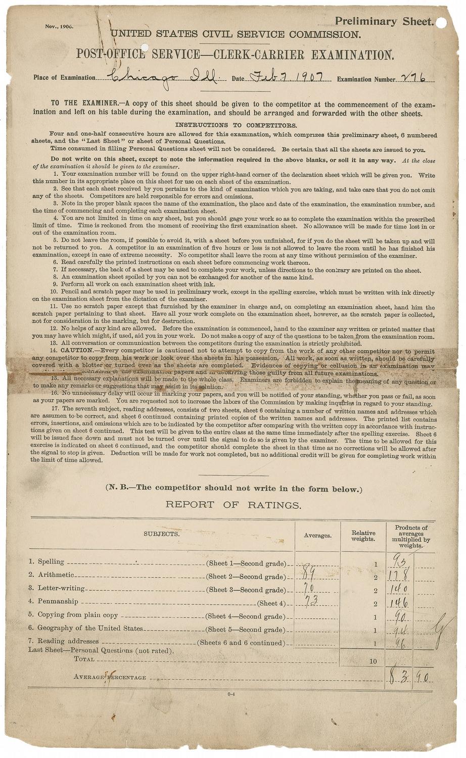 Also included is Rockne’s seven page Post Office Service—Clerk-Carrier Examination, given on February 7, 1907, completely filled out in Rockne’s hand, with the third page of the exam not present. First page bears printed instructions, with Rockne’s individual section scores listed at the bottom, as well as his total average percentage, as “83.90.”