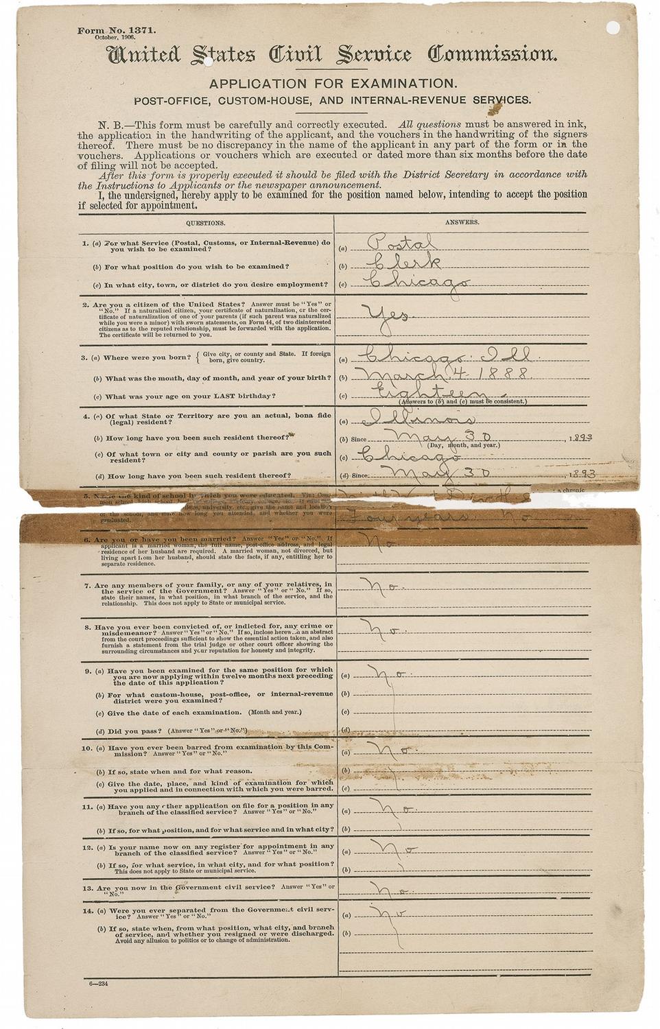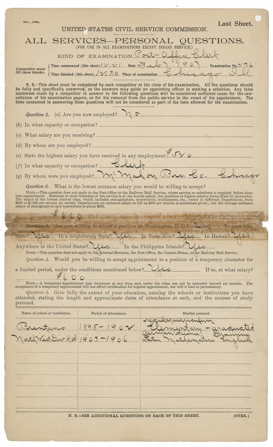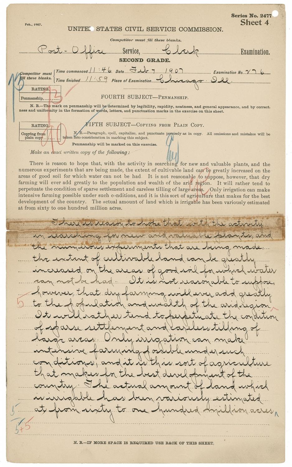 Postal examination application and exam filled out and taken by the then 19-year old Rockne. Included are the notorized two-page 8.5 x 14 Civil Service examination application, dated January 28, 1907, filled out and signed twice by Rockne, who answers over 30 questions regarding his personal history and background, including his age, birthplace, residence, current occupation “clerk,” current salary “$520,” and his health record. Signed at the conclusion, “Knute Rockne,” adding his mailing address underneath.