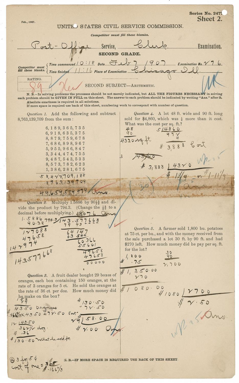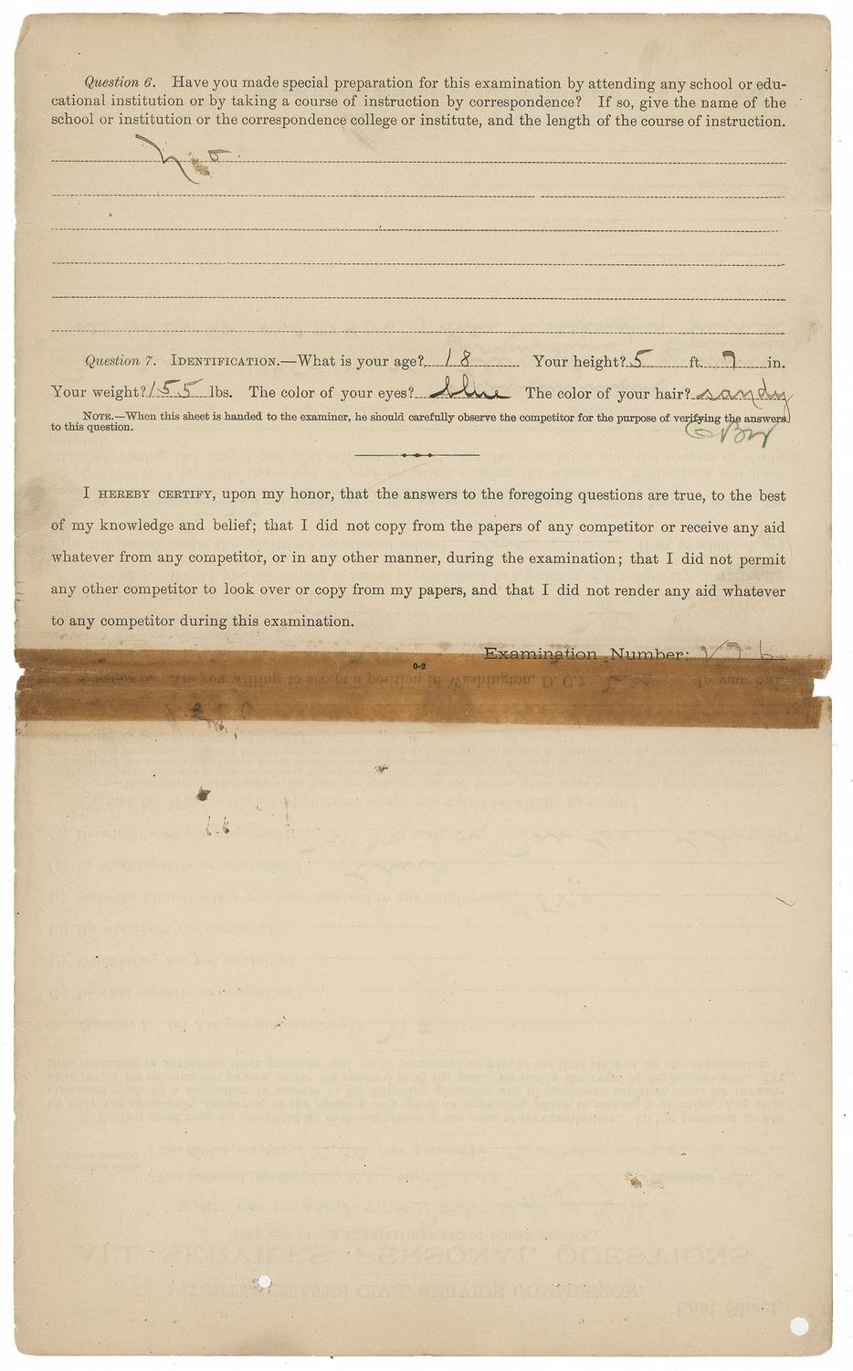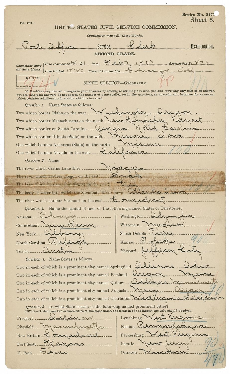 Postal examination application and exam filled out and taken by the then 19-year old Rockne. Included are the notorized two-page 8.5 x 14 Civil Service examination application, dated January 28, 1907, filled out and signed twice by Rockne, who answers over 30 questions regarding his personal history and background, including his age, birthplace, residence, current occupation “clerk,” current salary “$520,” and his health record. Signed at the conclusion, “Knute Rockne,” adding his mailing address underneath.