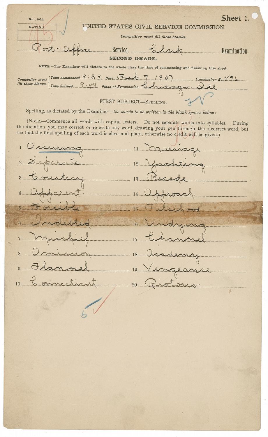 Sheet One is a spelling exam, with Rockne being given 20 words to spell, and scoring a 95.